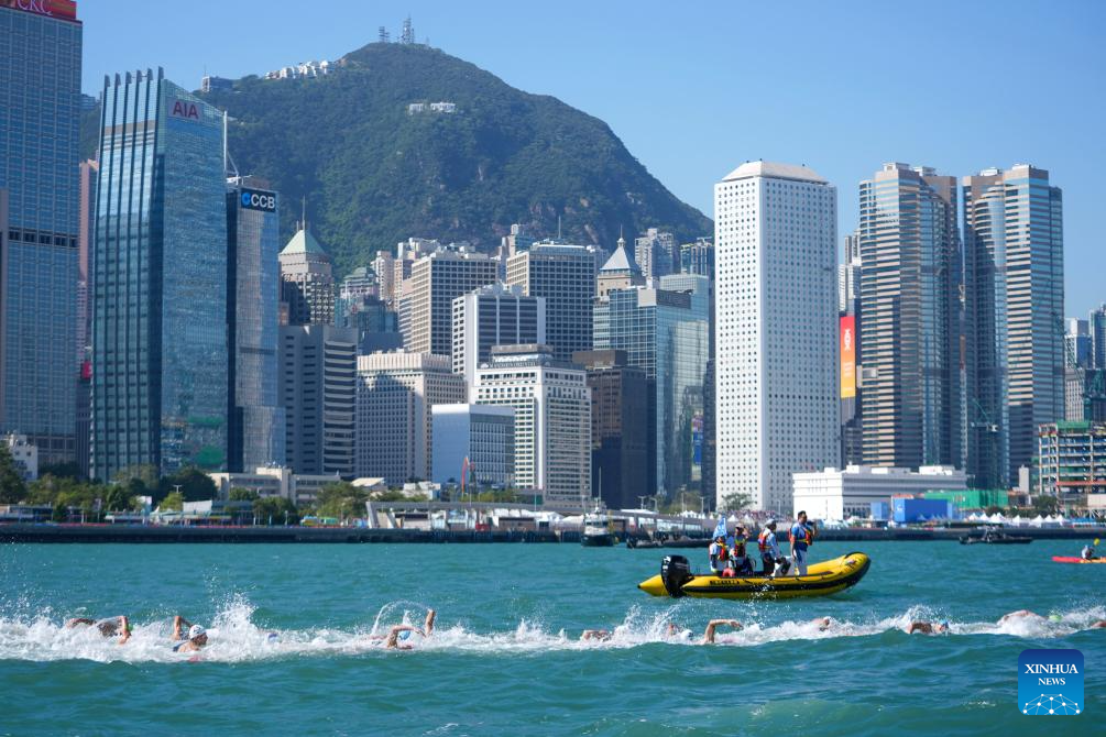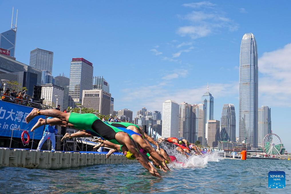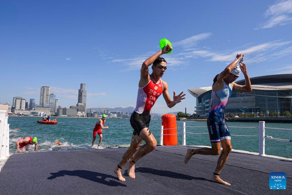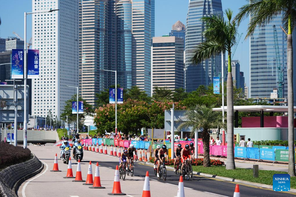 Athletes compete during the men's individual triathlon at China's 15th National Games in Hong Kong, south China, Nov. 15, 2025. (Xinhua/Lui Sui Wai)
