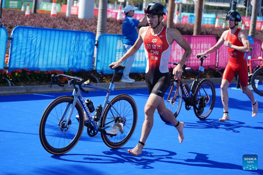 Fan Junjie (front, L) of Henan competes during the men's individual triathlon at China's 15th National Games in Hong Kong, south China, Nov. 15, 2025. (Xinhua/Lui Sui Wai)