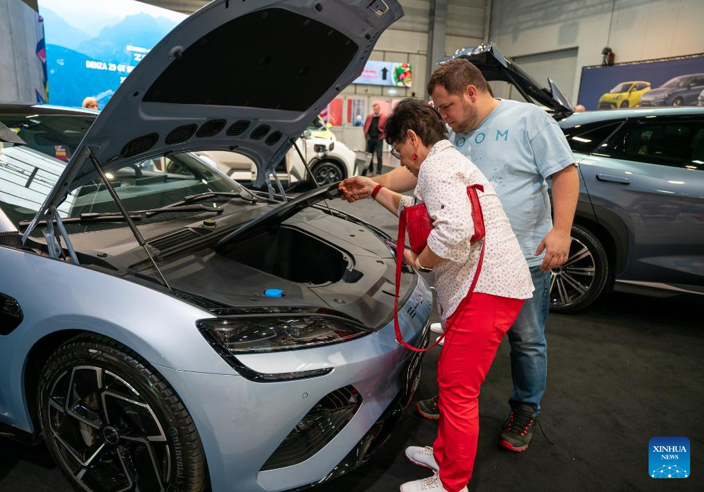 The e-SALON, a trade fair for passenger and commercial vehicles with alternative propulsion, opened to public on Friday and will last until Sunday. (Photo by Dana Kesnerova/Xinhua)