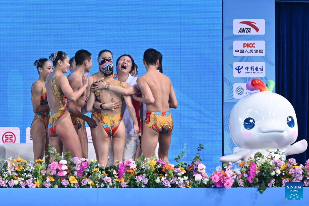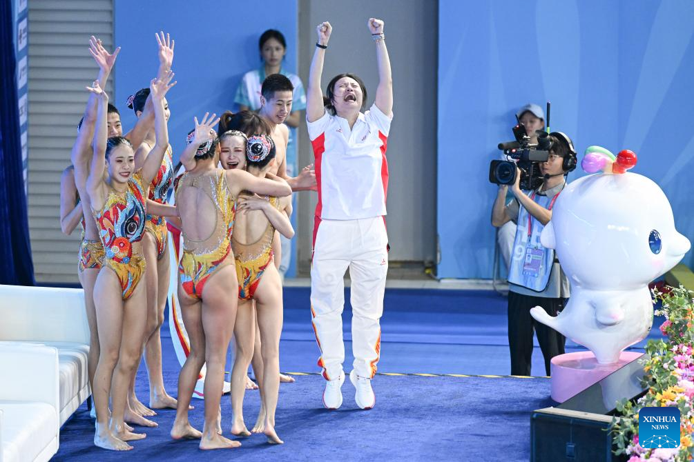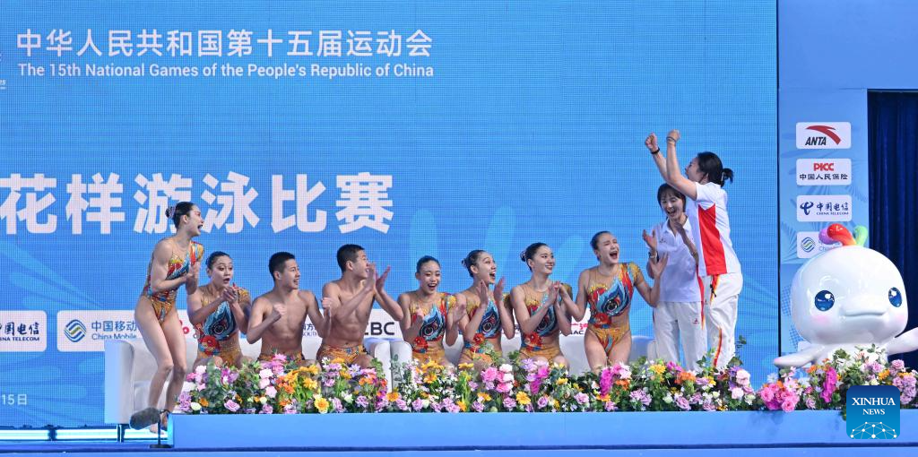 Team Sichuan celebrate after the team acrobatic final of artistic swimming at China's 15th National Games in Jiangmen, south China's Guangdong Province, Nov. 14, 2025. (Xinhua/Chen Zhonghao)