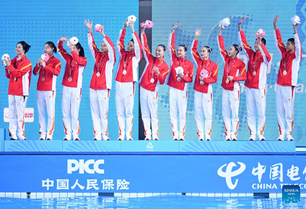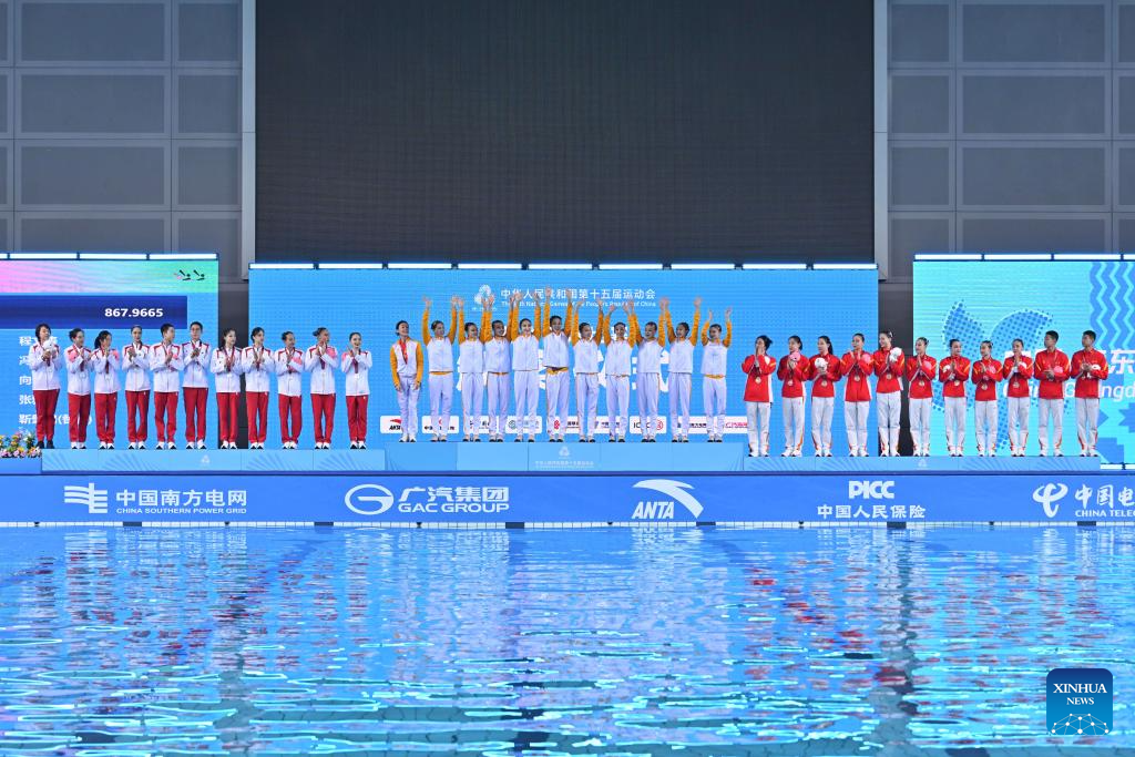 Bronze medalists team Sichuan wave to spectators during the awarding ceremony for team events of artistic swimming at China's 15th National Games in Jiangmen, south China's Guangdong Province, Nov. 14, 2025. (Xinhua/Li Xin)