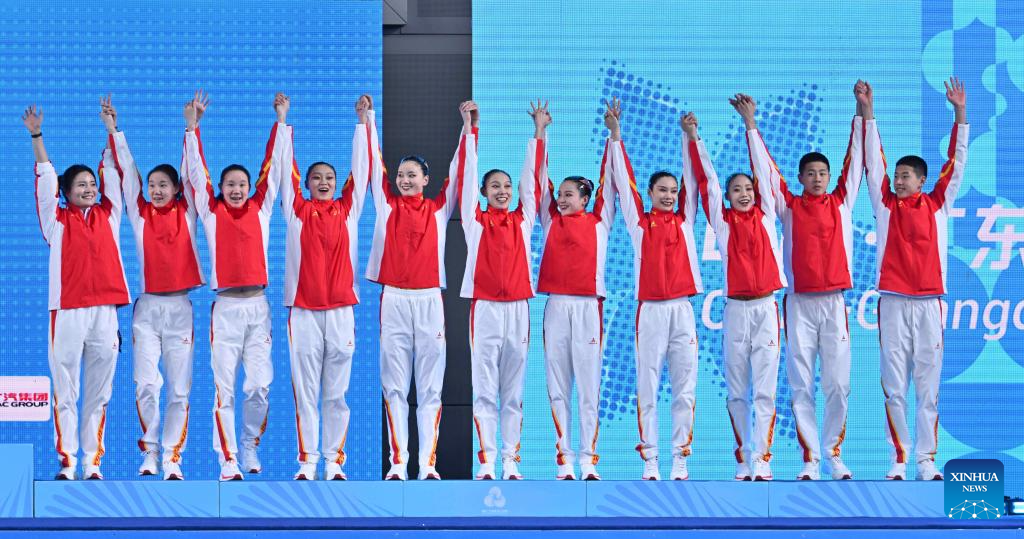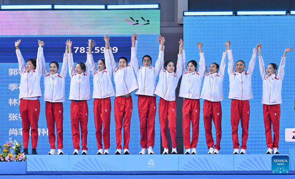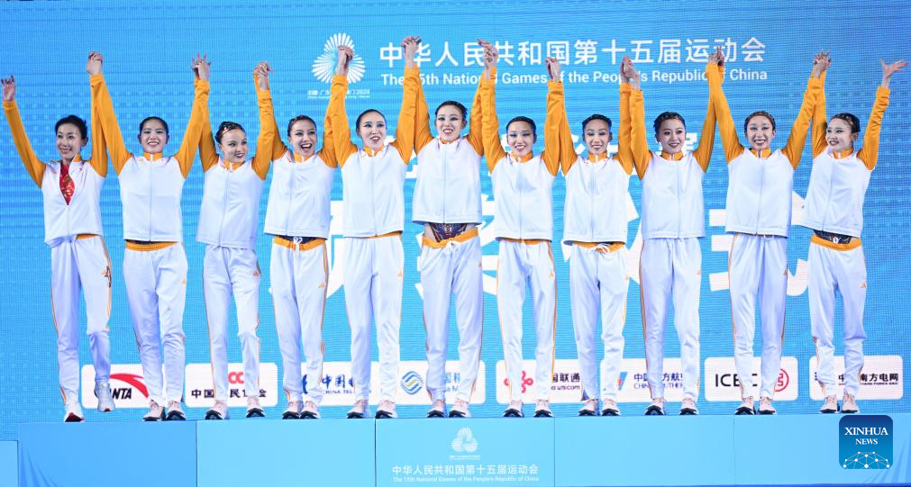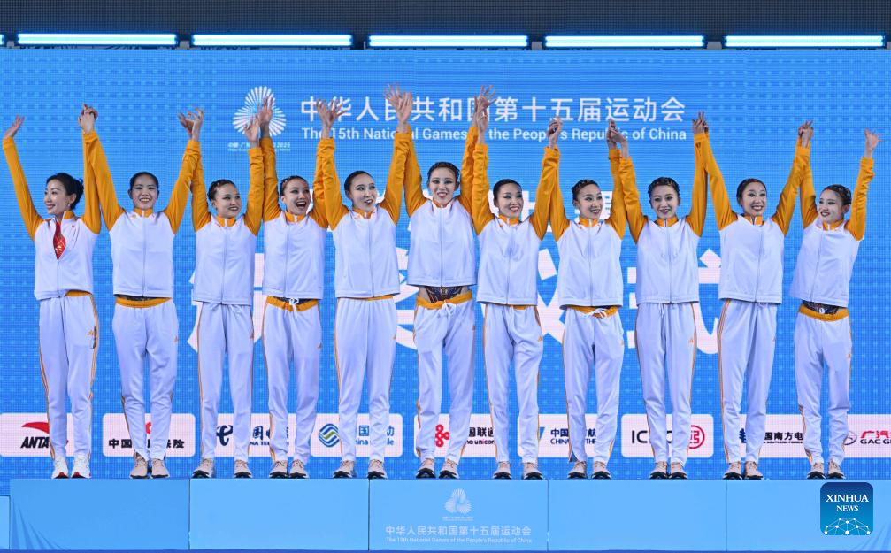 Gold medalists team Beijing Sport University wave to spectators during the awarding ceremony for team events of artistic swimming at China's 15th National Games in Jiangmen, south China's Guangdong Province, Nov. 14, 2025. (Xinhua/Chen Zhonghao)