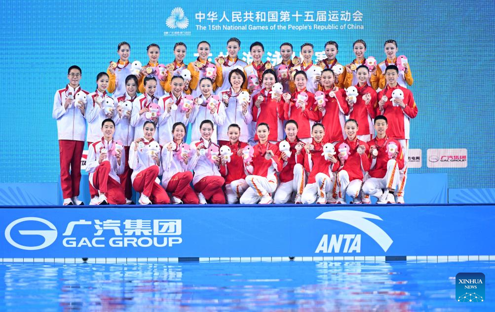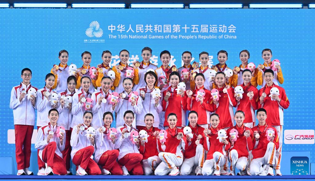 Gold medalists team Beijing Sport University, Silver medalists team Beijing and bronze medalist team Sichuan pose with their coaches during the awarding ceremony for team events of artistic swimming at China's 15th National Games in Jiangmen, south China's Guangdong Province, Nov. 14, 2025. (Xinhua/Li Xin)