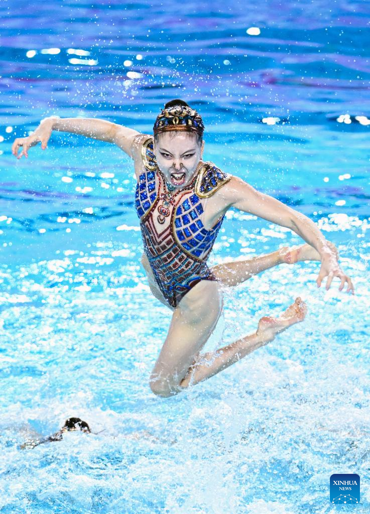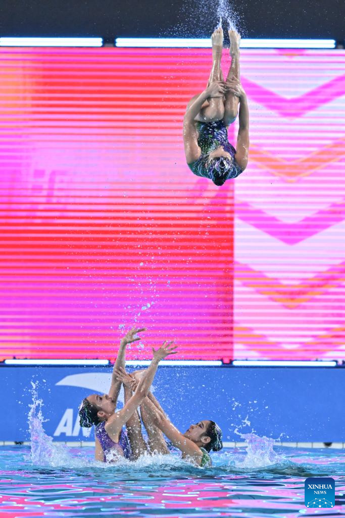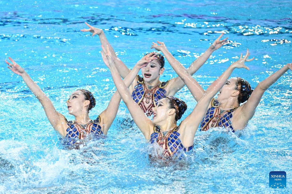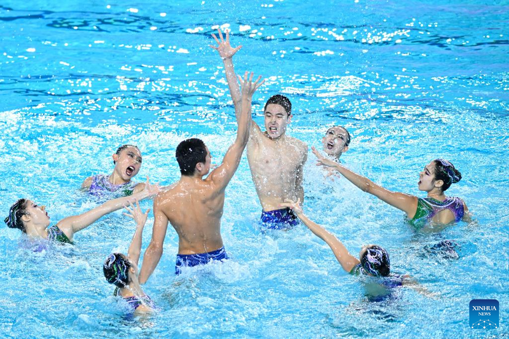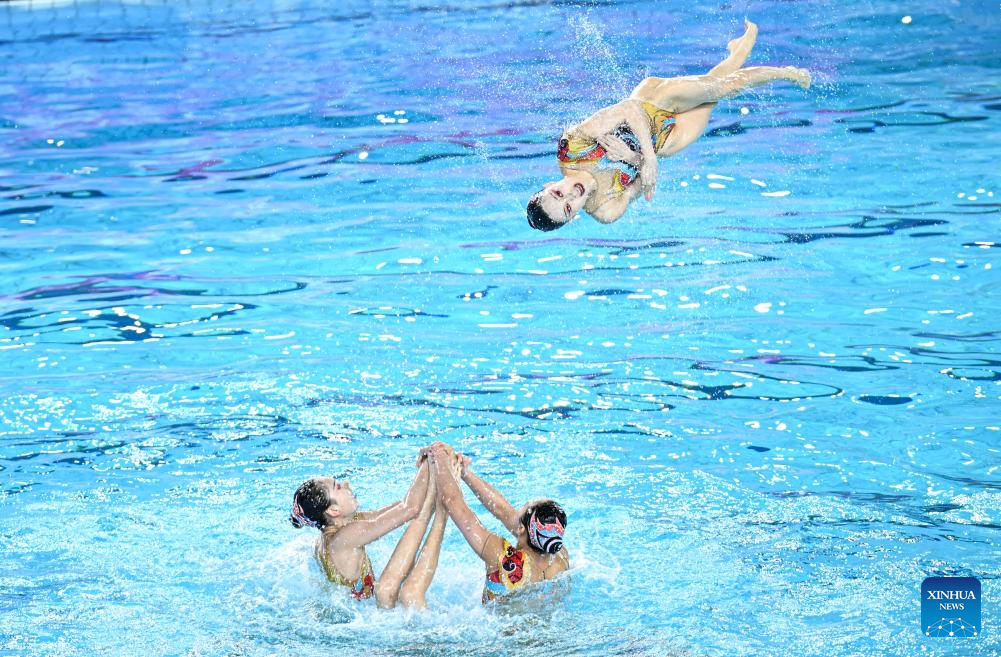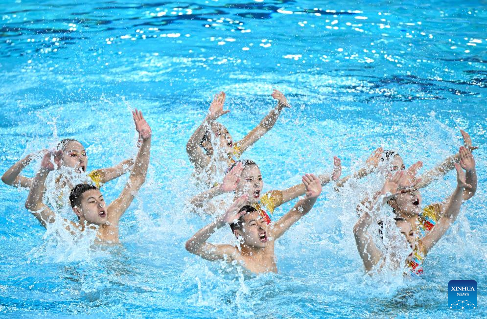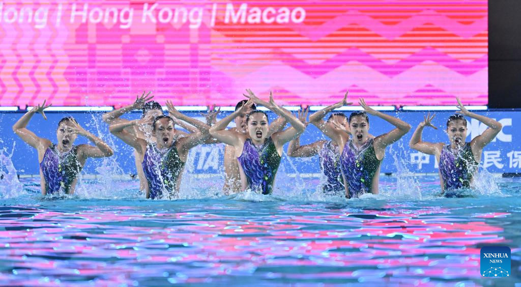 Team Sichuan perform during the team acrobatic final of artistic swimming at China's 15th National Games in Jiangmen, south China's Guangdong Province, Nov. 14, 2025. (Xinhua/Chen Zhonghao)