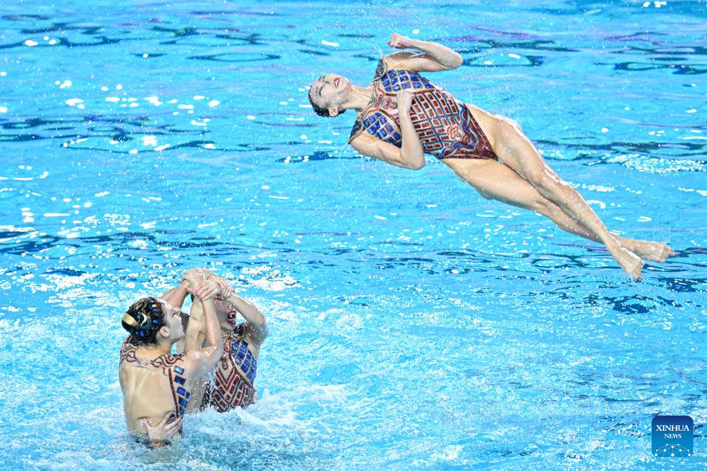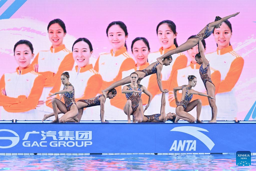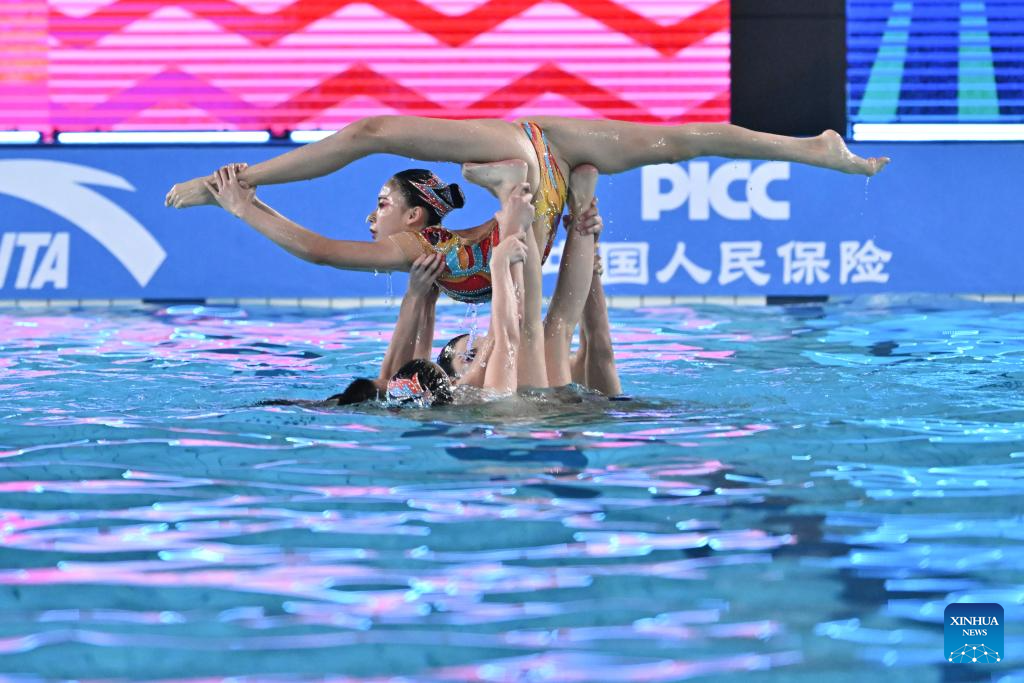 Team Sichuan perform during the team acrobatic final of artistic swimming at China's 15th National Games in Jiangmen, south China's Guangdong Province, Nov. 14, 2025. (Xinhua/Li Xin)