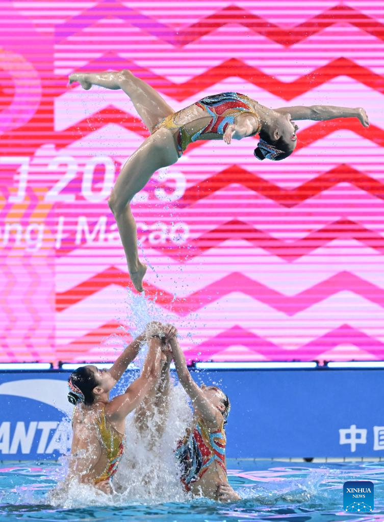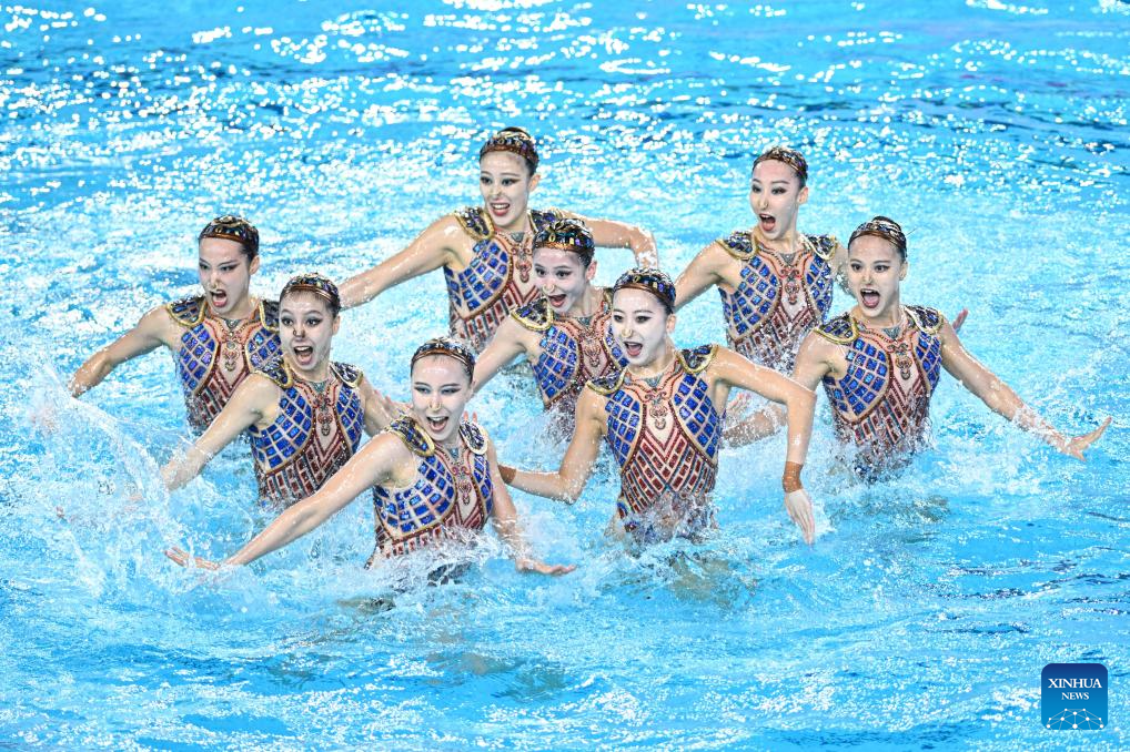 Team Beijing Sport University perform during the team acrobatic final of artistic swimming at China's 15th National Games in Jiangmen, south China's Guangdong Province, Nov. 14, 2025. (Xinhua/Li Xin)