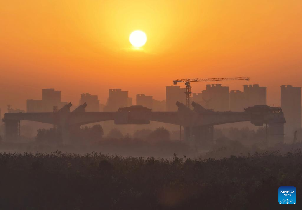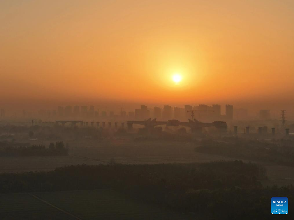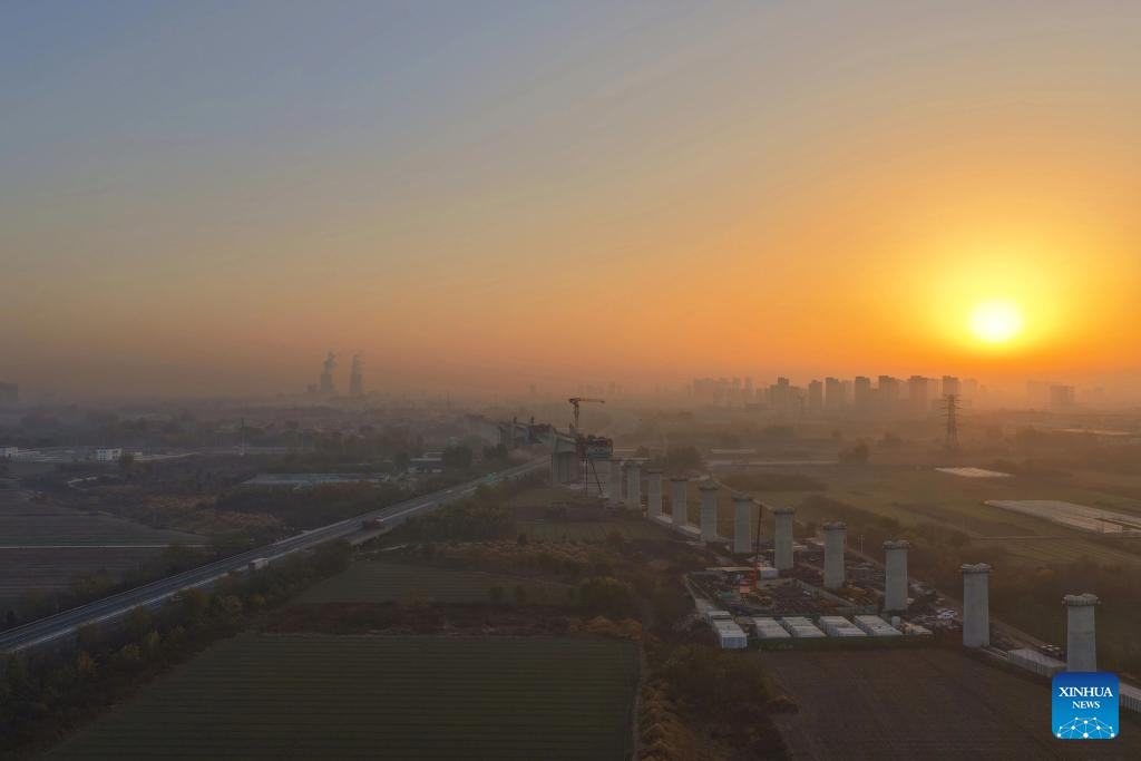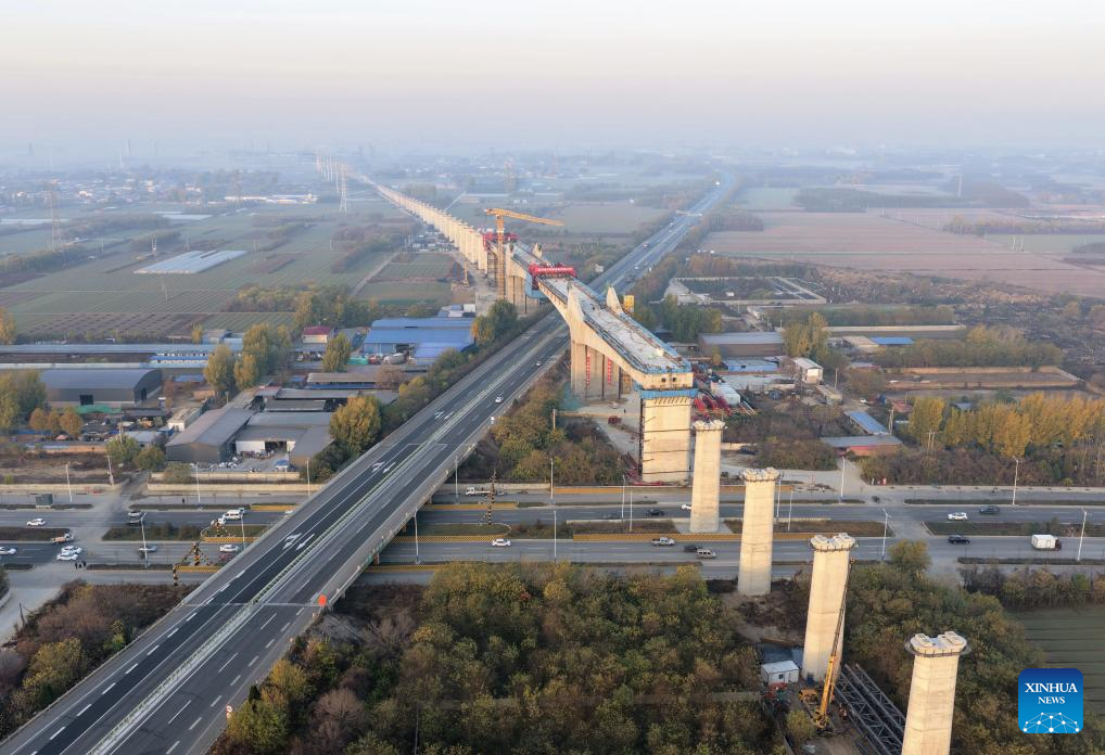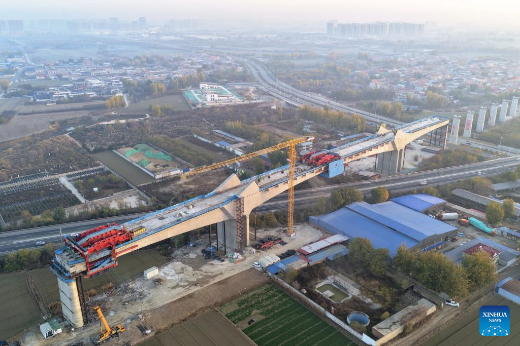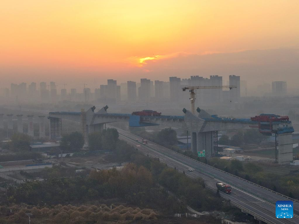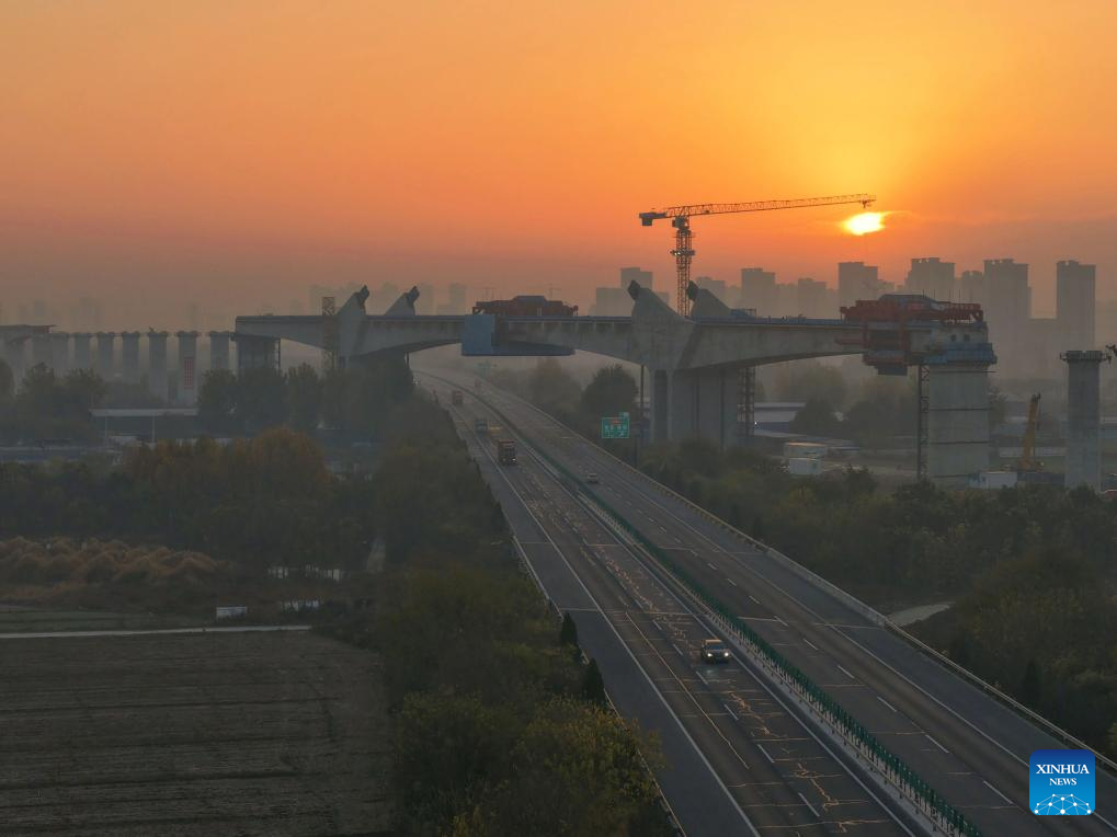 An aerial drone photo taken on Nov. 15, 2025 show the construction site of a super major bridge of the Xiong'an-Xinzhou high-speed railway, which crosses over the Baoding-Cangzhou expressway, in north China's Hebei Province. The tied-arch bridge part of the super major bridge was successfully closed on Saturday.