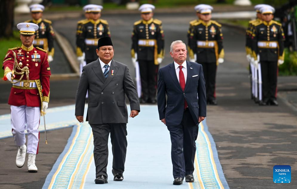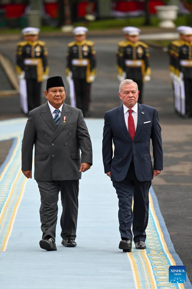 Indonesian President Prabowo Subianto (L) and visiting King Abdullah II of Jordan inspect the guard of honor during a welcome ceremony in Jakarta, Indonesia, Nov. 14, 2025. (Photo by Zulkarnain/Xinhua)