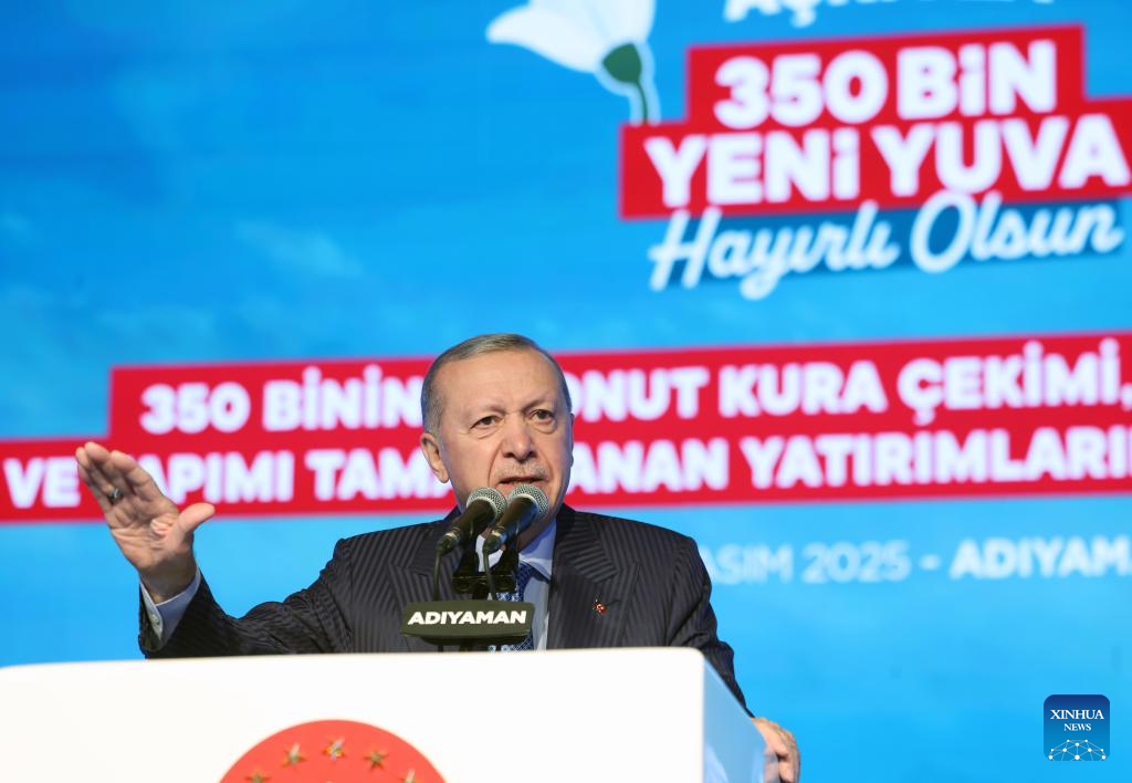 Turkish President Recep Tayyip Erdogan attends a ceremony in Adiyaman province, Türkiye, Nov. 15, 2025. Erdogan on Saturday attended a ceremony in Adiyaman province to deliver newly built post-quake homes, reaffirming the government's commitment to supporting survivors of the 2023 earthquakes. (Mustafa Kaya/Handout via Xinhua)