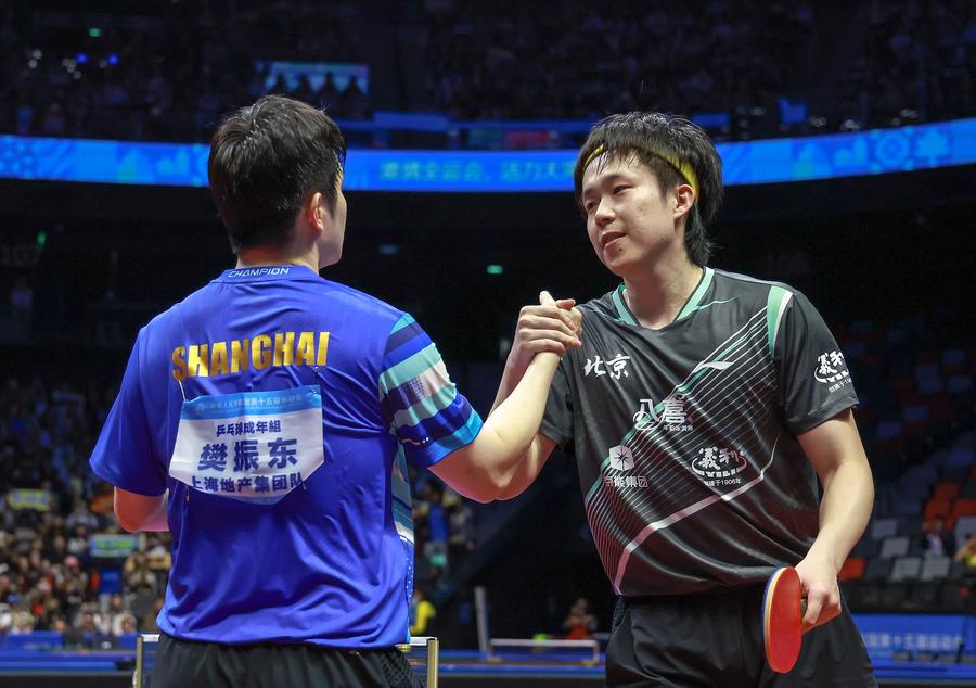 MACAO, Nov. 15 (Xinhua) -- In a much-anticipated clash, Shanghai's Fan Zhendong defeated Beijing's Wang Chuqin 4-2 in the table tennis men's singles semifinals of China's 15th National Games at Macao's Galaxy Arena on Saturday.