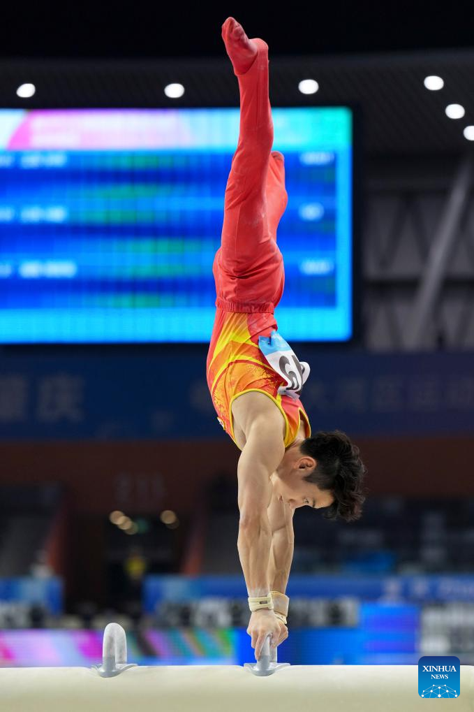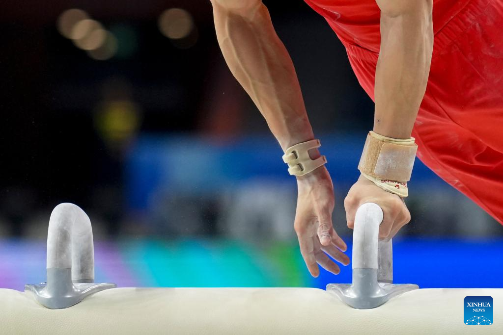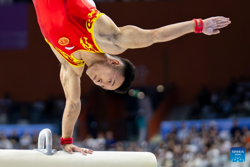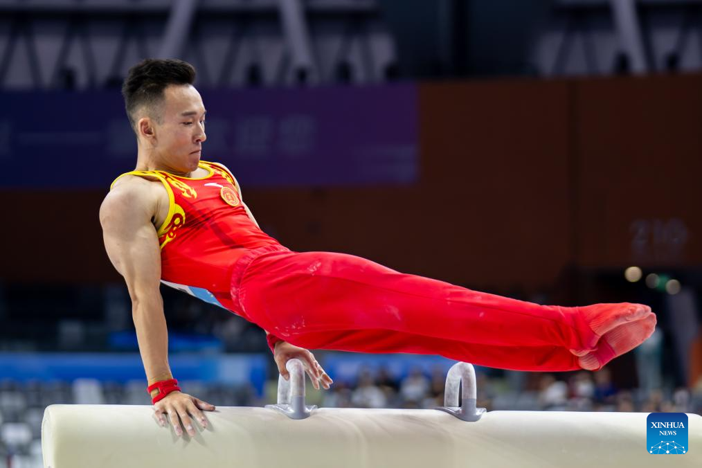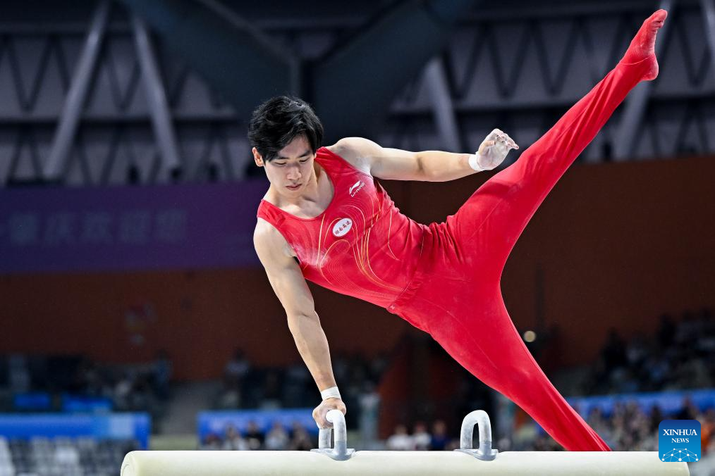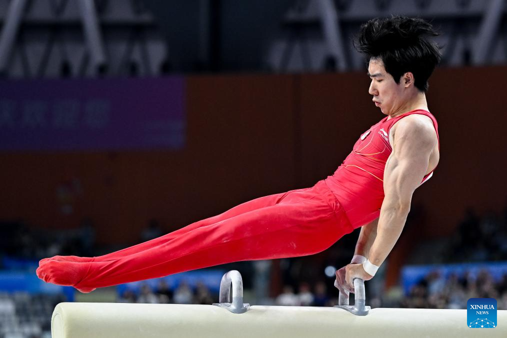 Zhang Boheng of Hunan competes in pommel horse during the men's pommel horse-rings-parallel bars all-around final of artistic gymnastics at China's 15th National Games in Zhaoqing, south China's Guangdong Province, Nov. 14, 2025. (Xinhua/Du Zixuan)