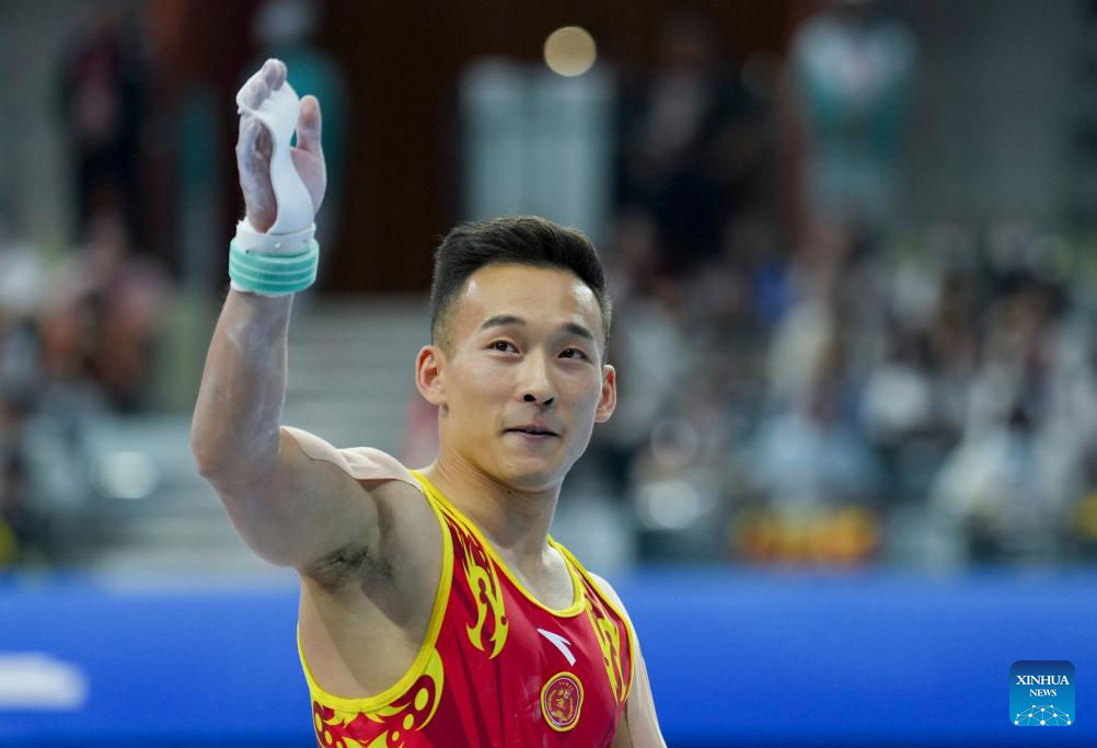 Xiao Ruoteng of Beijing greets the spectators during the artistic gymnastics men's individual all-around final at China's 15th National Games in Zhaoqing, south China's Guangdong Province, Nov. 14, 2025. (Xinhua/Xu Bingjie)
