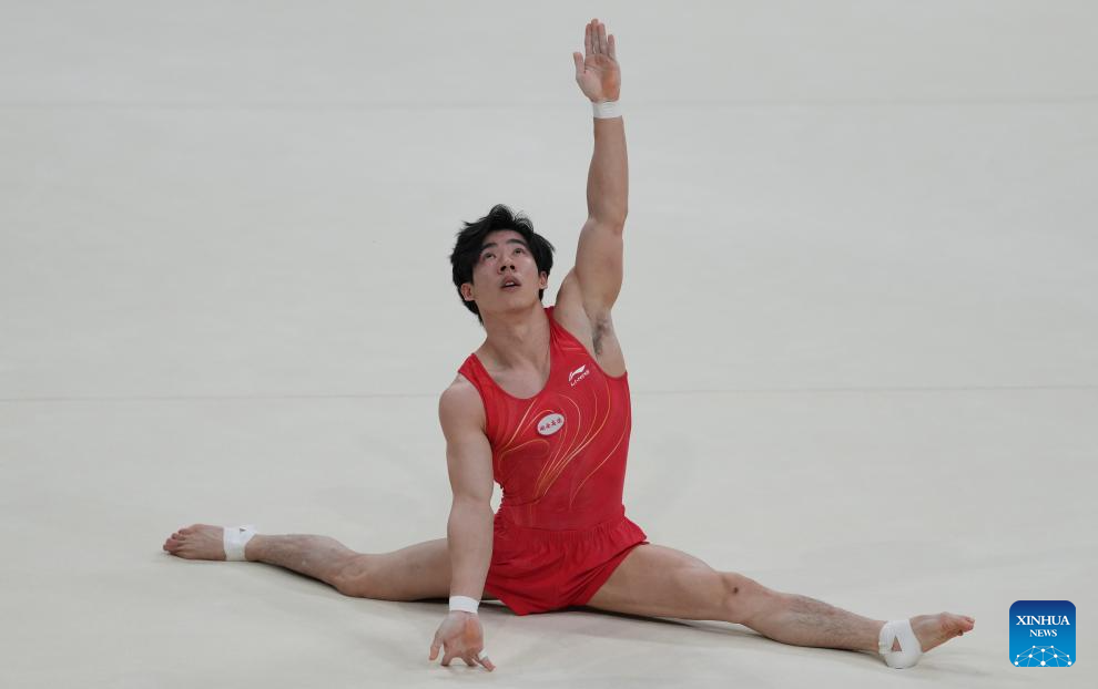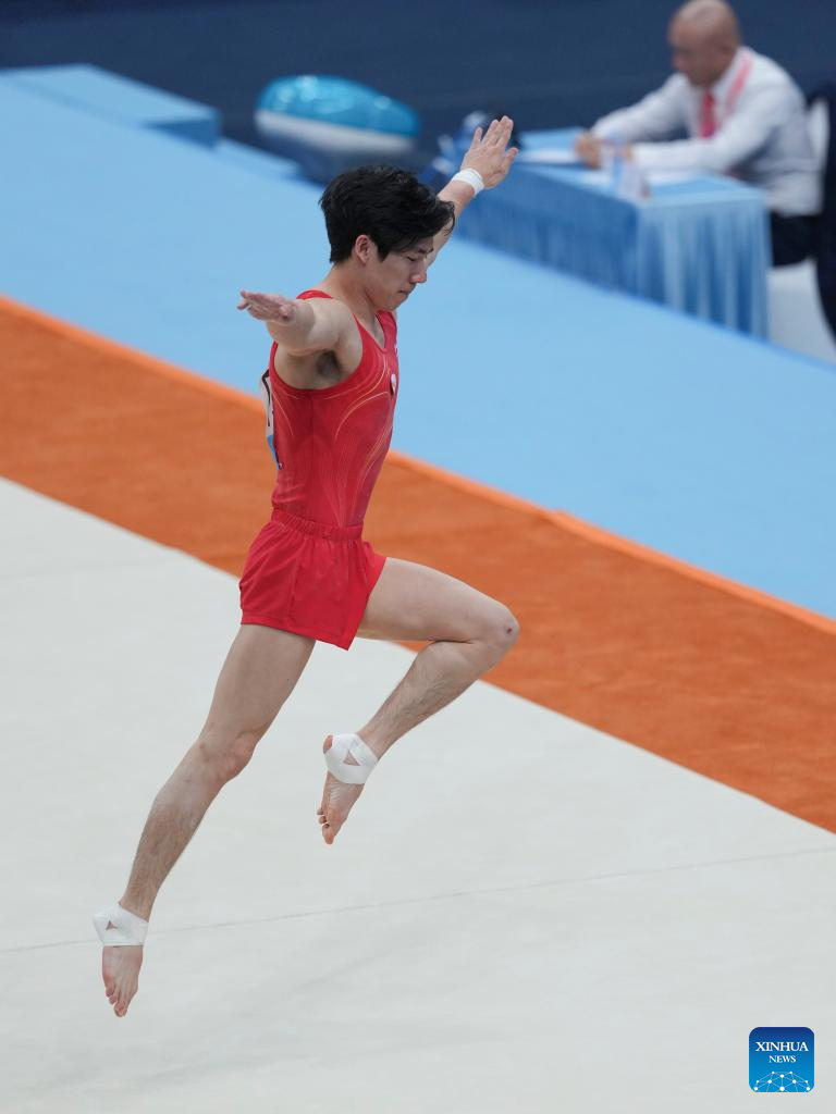 Xiao Ruoteng of Beijing competes in floor exercise during the artistic gymnastics men's individual all-around final at China's 15th National Games in Zhaoqing, south China's Guangdong Province, Nov. 14, 2025. (Xinhua/Xu Bingjie)