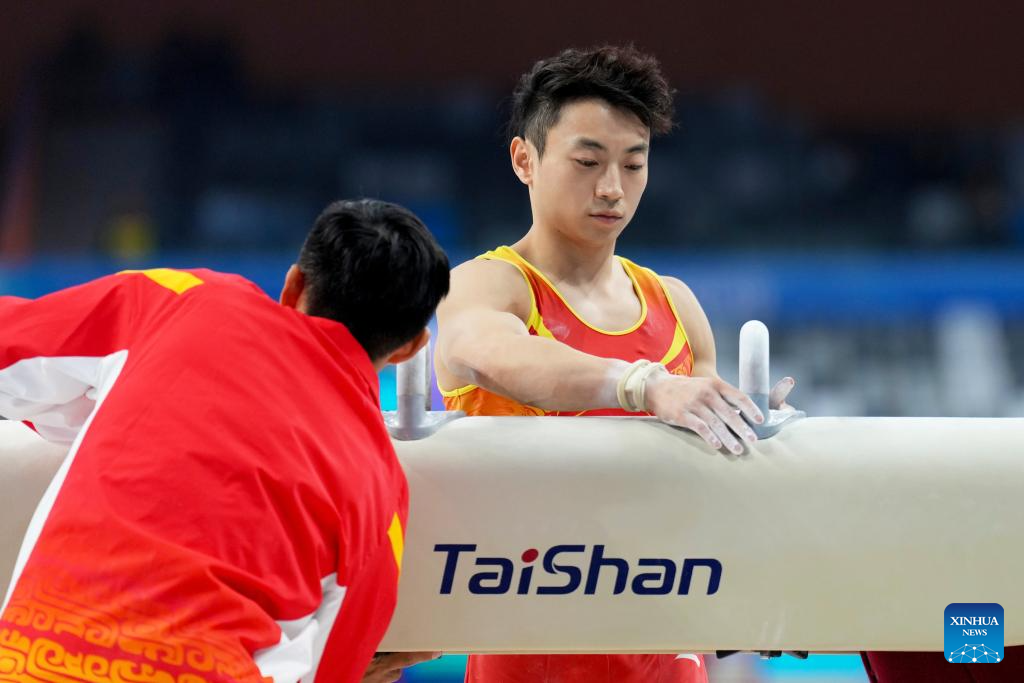 Yang Haonan of Zhejiang competes in pommel horse during the artistic gymnastics men's individual all-around final at China's 15th National Games in Zhaoqing, south China's Guangdong Province, Nov. 14, 2025. (Xinhua/Du Zixuan)