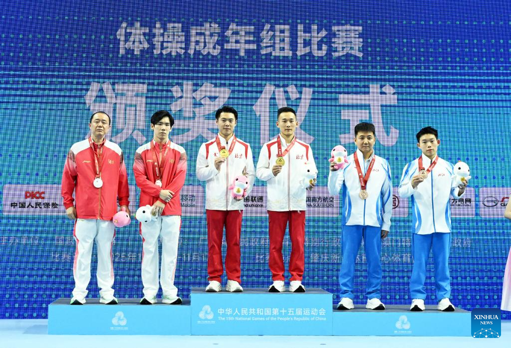 Gold medalist Xiao Ruoteng of Beijing, silver medalist Zhang Boheng of Hunan and bronze medalist Yang Haonan of Zhejiang pose with their coaches during the awarding ceremony after the artistic gymnastics men's individual all-around final at China's 15th National Games in Zhaoqing, south China's Guangdong Province, Nov. 14, 2025. (Xinhua/Zhu Xiang)