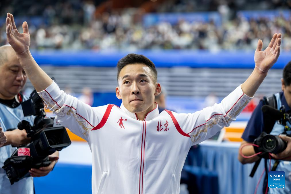 Xiao Ruoteng of Beijing celebrates after winning the artistic gymnastics men's individual all-around final at China's 15th National Games in Zhaoqing, south China's Guangdong Province, Nov. 14, 2025. (Xinhua/Du Zixuan)