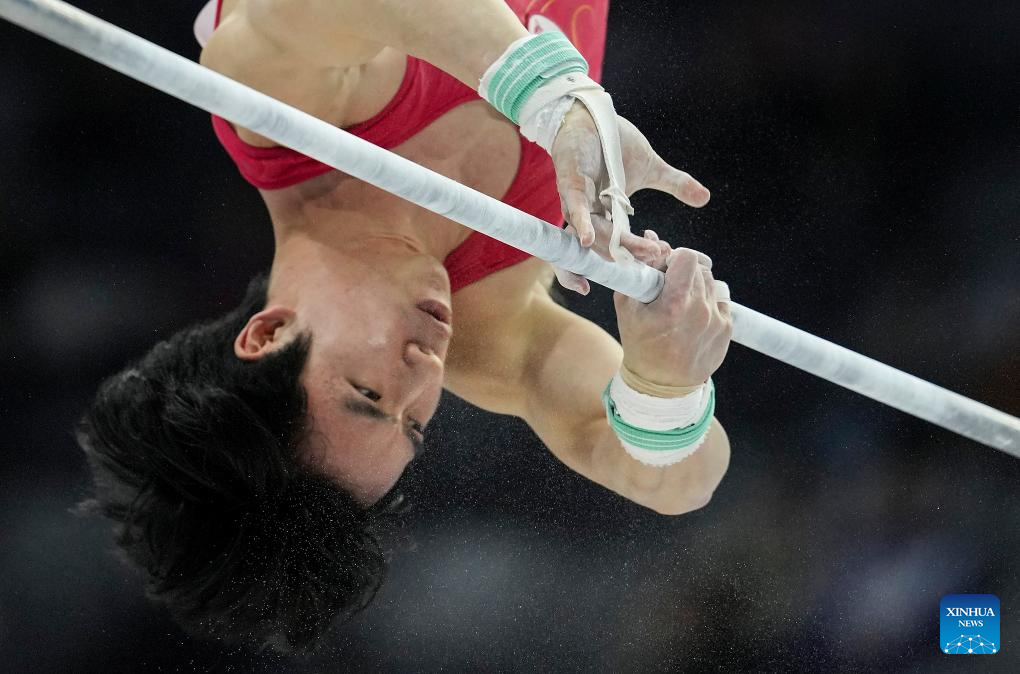 Zhang Boheng of Hunan competes in horizontal bar during the artistic gymnastics men's individual all-around final at China's 15th National Games in Zhaoqing, south China's Guangdong Province, Nov. 14, 2025. (Xinhua/Xu Bingjie)