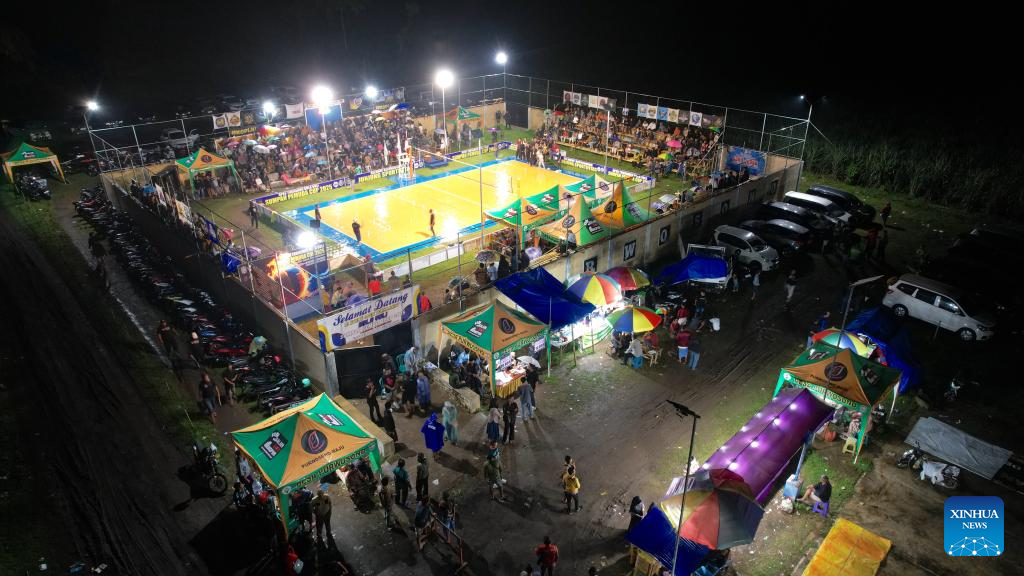A drone photo shows a volleyball match in Purwosono village, East Java Province, Indonesia, Nov. 13, 2025. (Xinhua/Cen Yunpeng)