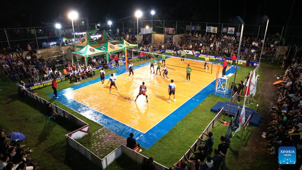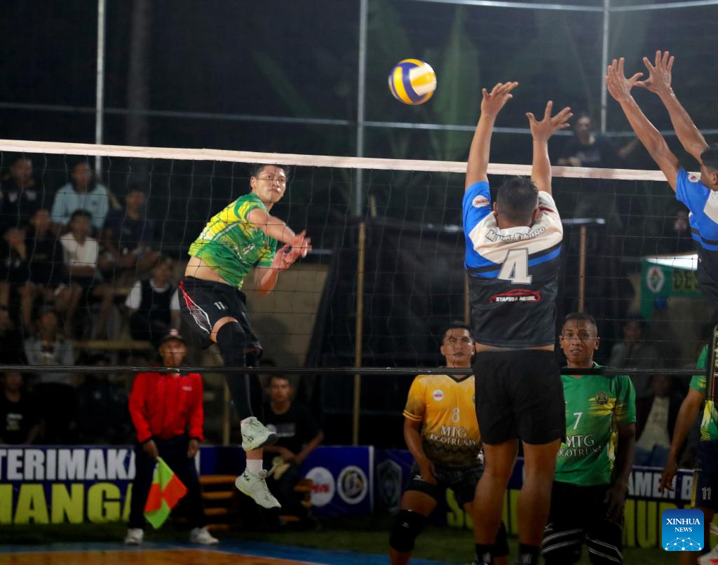 Athletes compete during the men's final of the volleyball competition in Purwosono village, East Java Province, Indonesia, Nov. 14, 2025. (Xinhua/Cen Yunpeng)