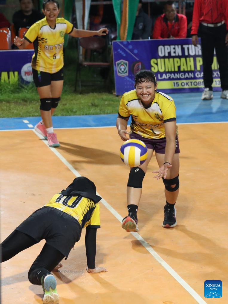 Athletes compete during the women's final of the volleyball competition in Purwosono village, East Java Province, Indonesia, Nov. 13, 2025. (Xinhua/Cen Yunpeng)