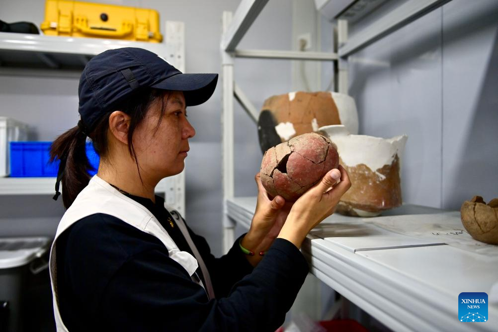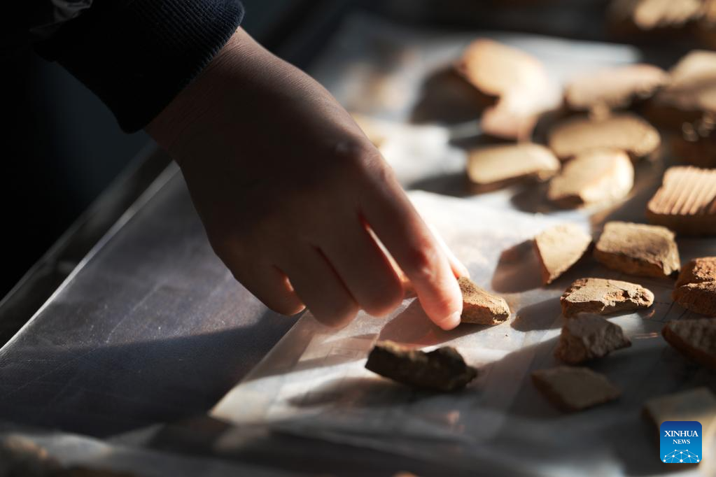A staff member sorts pottery fragments at a work station of the Niuheliang relic site in Chaoyang City, northeast China's Liaoning Province, Oct. 23, 2025. (Xinhua/Li Gang)