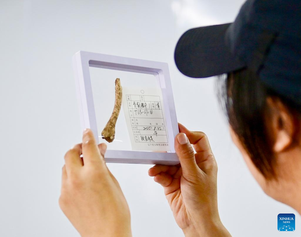 Yu Huaishi views a bone relic at a work station of the Niuheliang relic site in Chaoyang City, northeast China's Liaoning Province, Sept. 28, 2025. Yu Huaishi, a researcher at the Liaoning provincial institute of cultural relics and archaeology, has been searching for pottery fragments in the mountainous areas in western Liaoning since 2017 to identify traces of people's daily life in the Hongshan Culture.