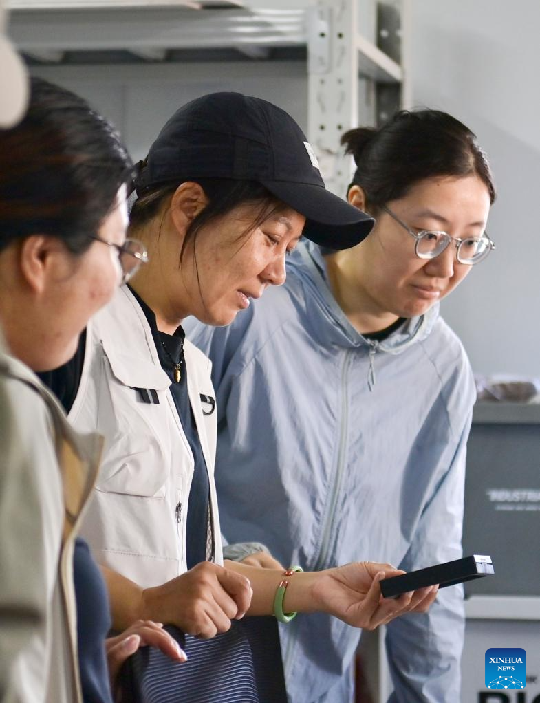 Yu Huaishi (C) and her colleagues view a relic at a work station of the Niuheliang relic site in Chaoyang City, northeast China's Liaoning Province, Sept. 28, 2025. (Xinhua/Wu Qinghao)