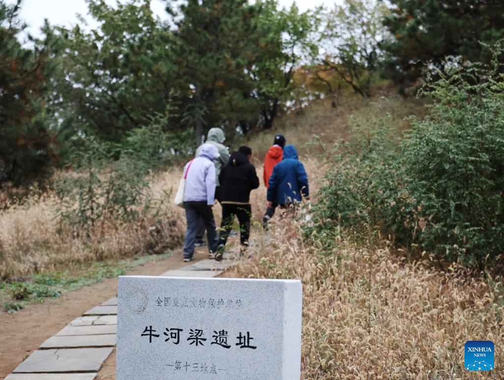 Yu Huaishi (2nd R) and her colleagues work at the Niuheliang relic site in Chaoyang City, northeast China's Liaoning Province, Oct. 24, 2025. (Xinhua/Li Gang)