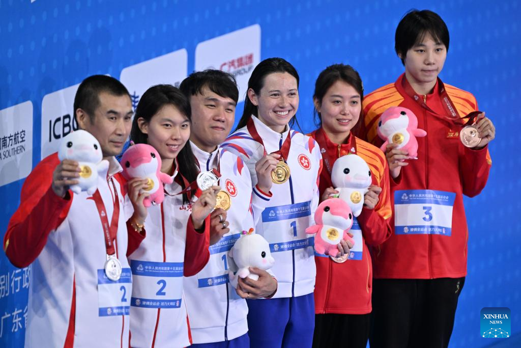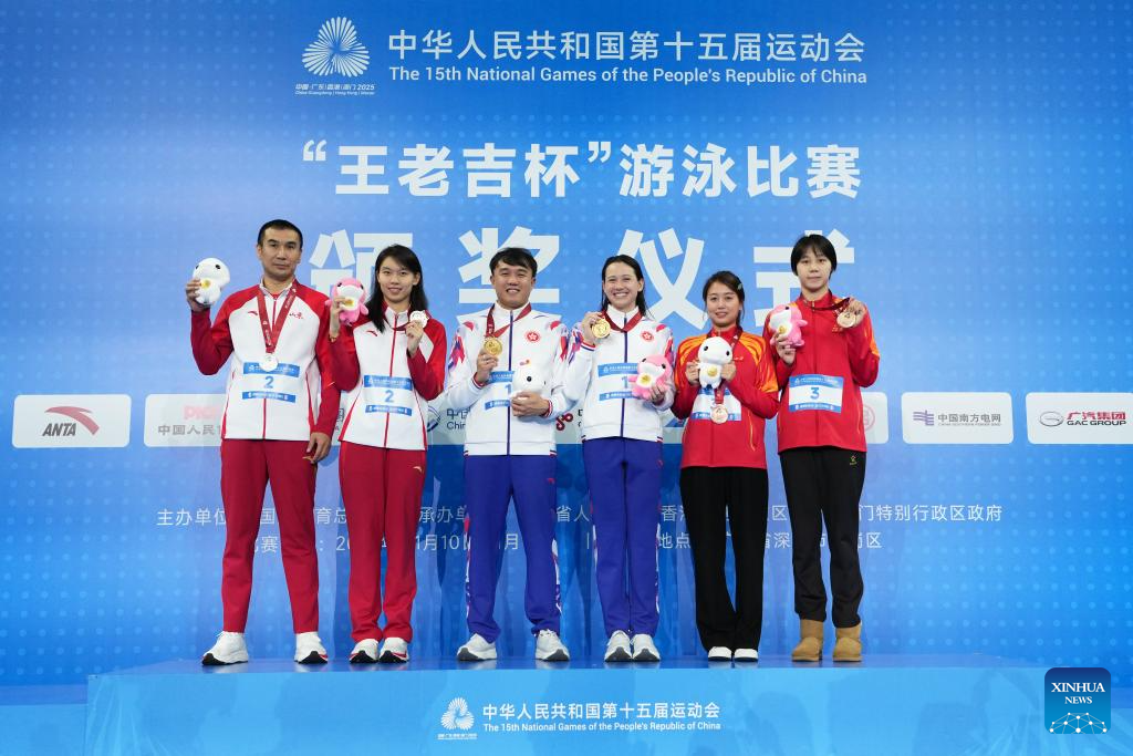 Gold medalist Siobhan Bernadette Haughey of Hong Kong, silver medalist Yang Junxuan of Shandong, bronze medalist Cheng Yujie of Jiangxi pose with their coaches during the awarding ceremony for the women's 100m freestyle of swimming at China's 15th National Games in Shenzhen, south China's Guangdong Province, Nov. 15, 2025. (Xinhua/Chen Yichen)