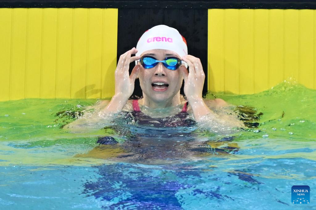 Siobhan Bernadette Haughey of Hong Kong reacts after the women's 100m freestyle final of swimming at China's 15th National Games in Shenzhen, south China's Guangdong Province, Nov. 15, 2025. (Xinhua/Xue Yuge)