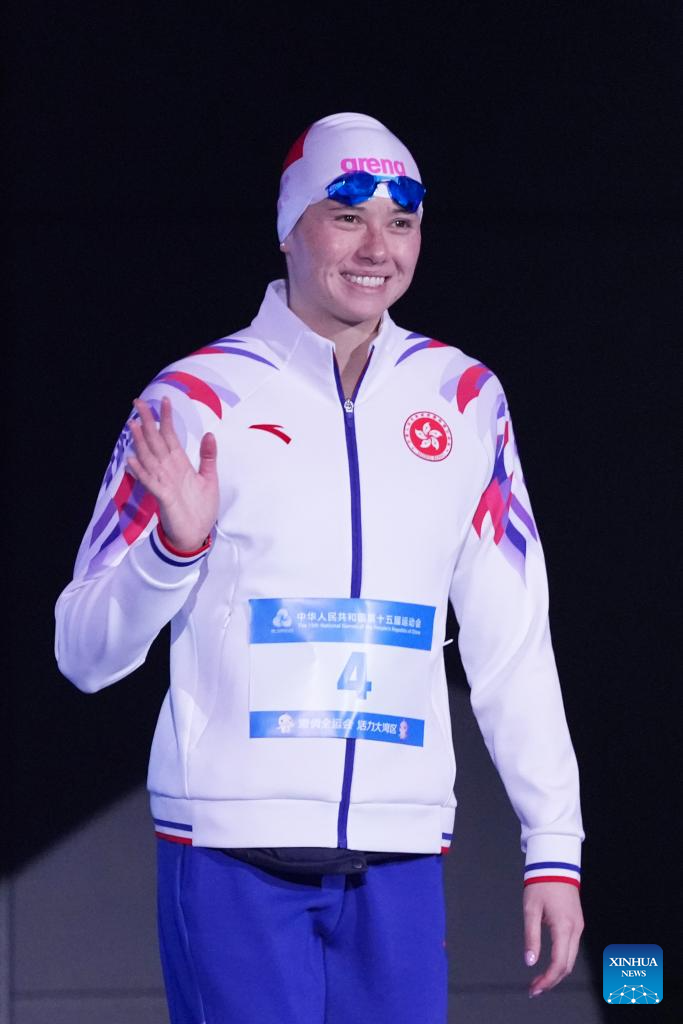 Gold medalist Siobhan Bernadette Haughey of Hong Kong greets the spectators after the awarding ceremony for the women's 100m freestyle of swimming at China's 15th National Games in Shenzhen, south China's Guangdong Province, Nov. 15, 2025. (Xinhua/Chen Yichen)