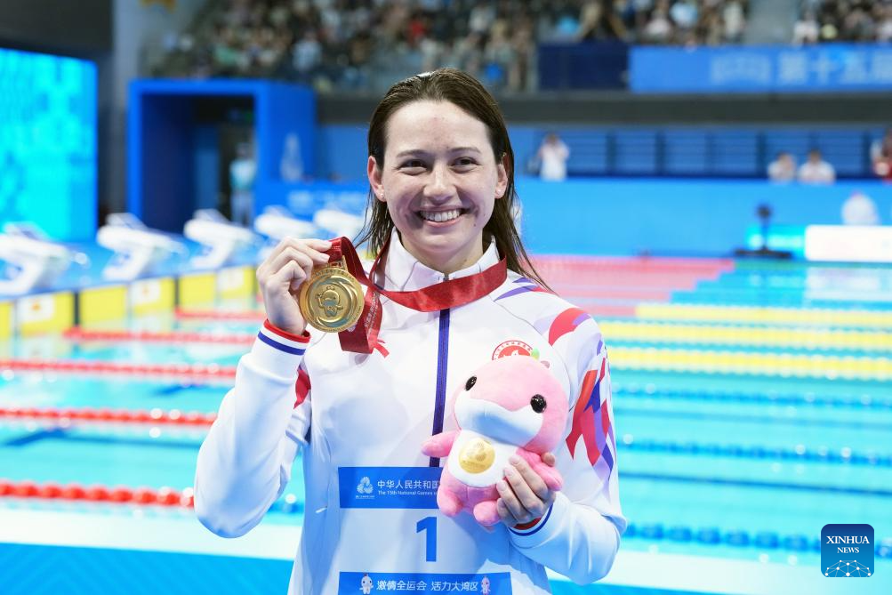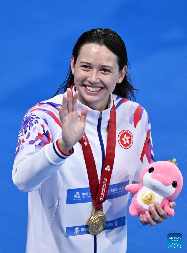 Gold medalist Siobhan Bernadette Haughey of Hong Kong poses after the awarding ceremony for the women's 100m freestyle of swimming at China's 15th National Games in Shenzhen, south China's Guangdong Province, Nov. 15, 2025. (Xinhua/Du Yu)