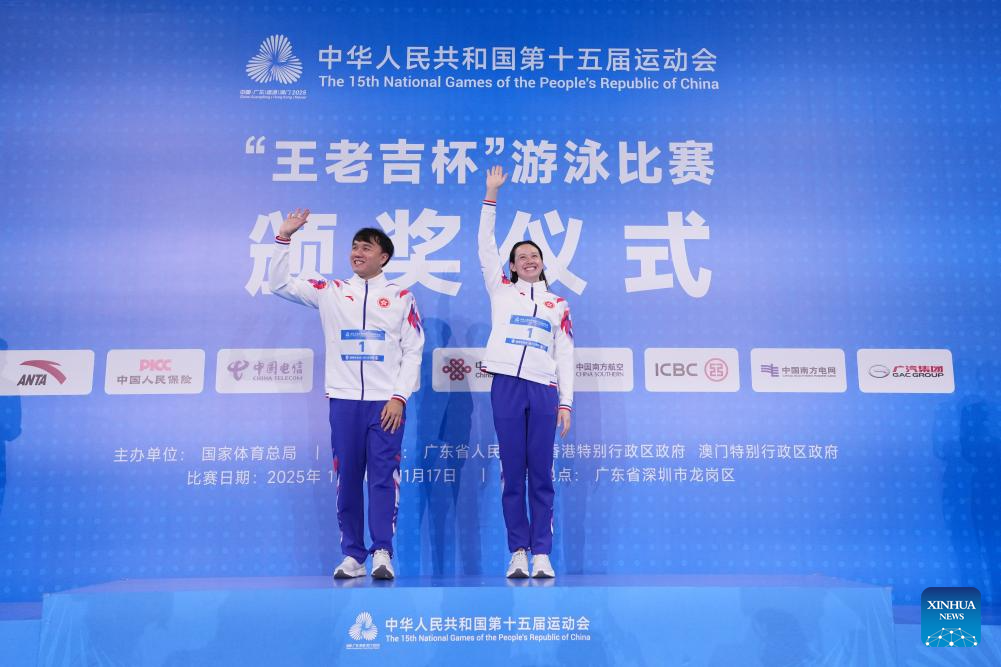 Gold medalist Siobhan Bernadette Haughey of Hong Kong and her coach wave during the awarding ceremony for the women's 100m freestyle of swimming at China's 15th National Games in Shenzhen, south China's Guangdong Province, Nov. 15, 2025. (Xinhua/Xia Yifang)