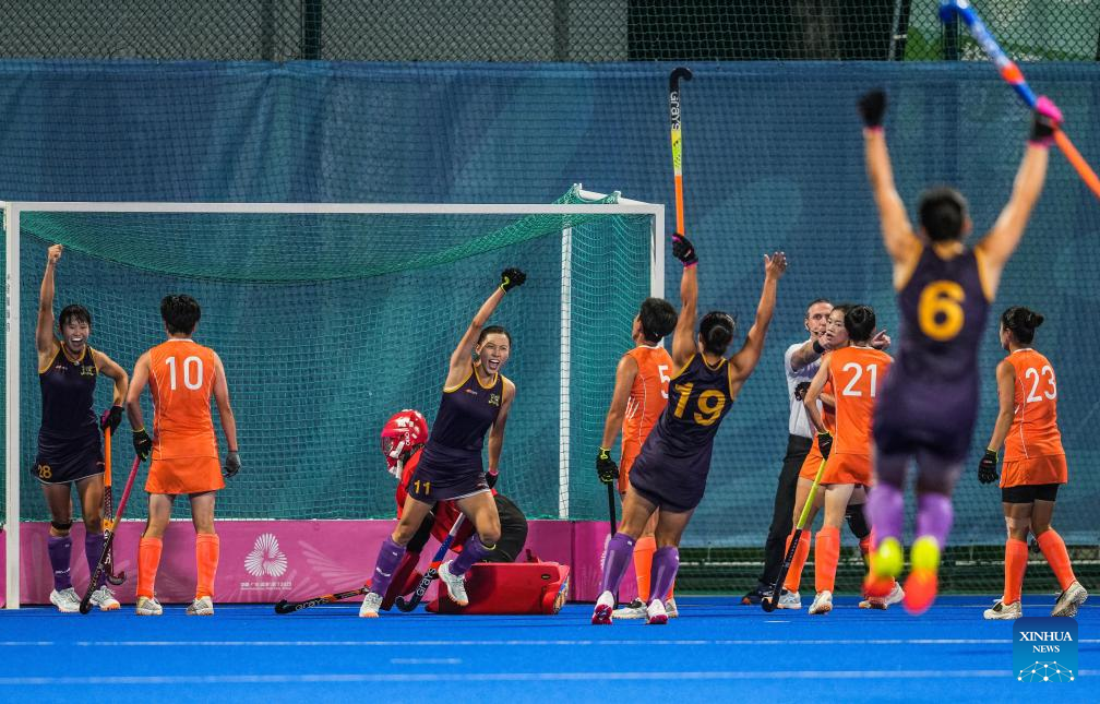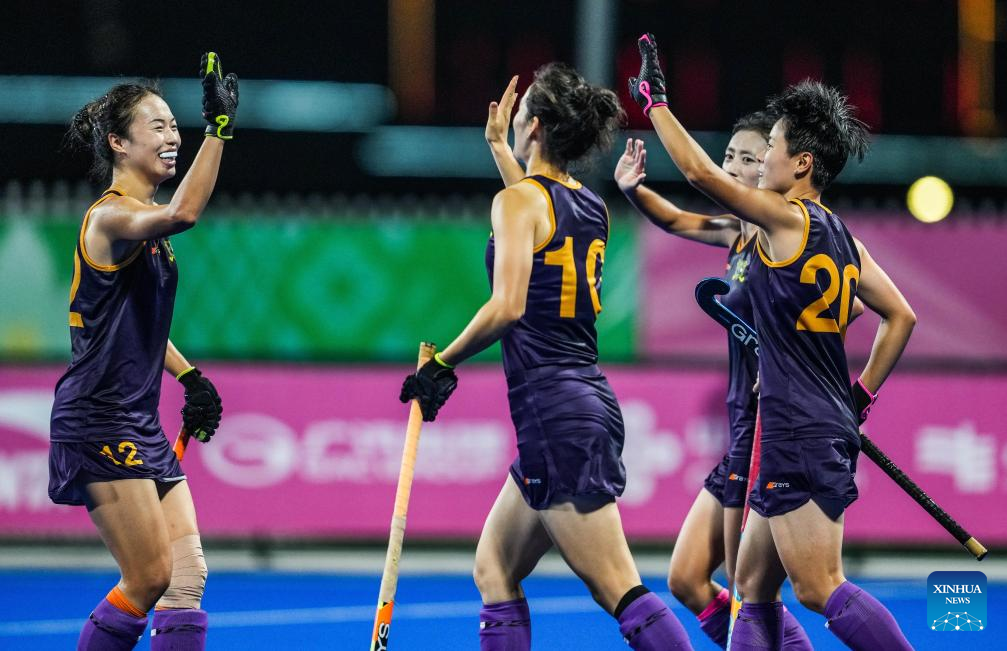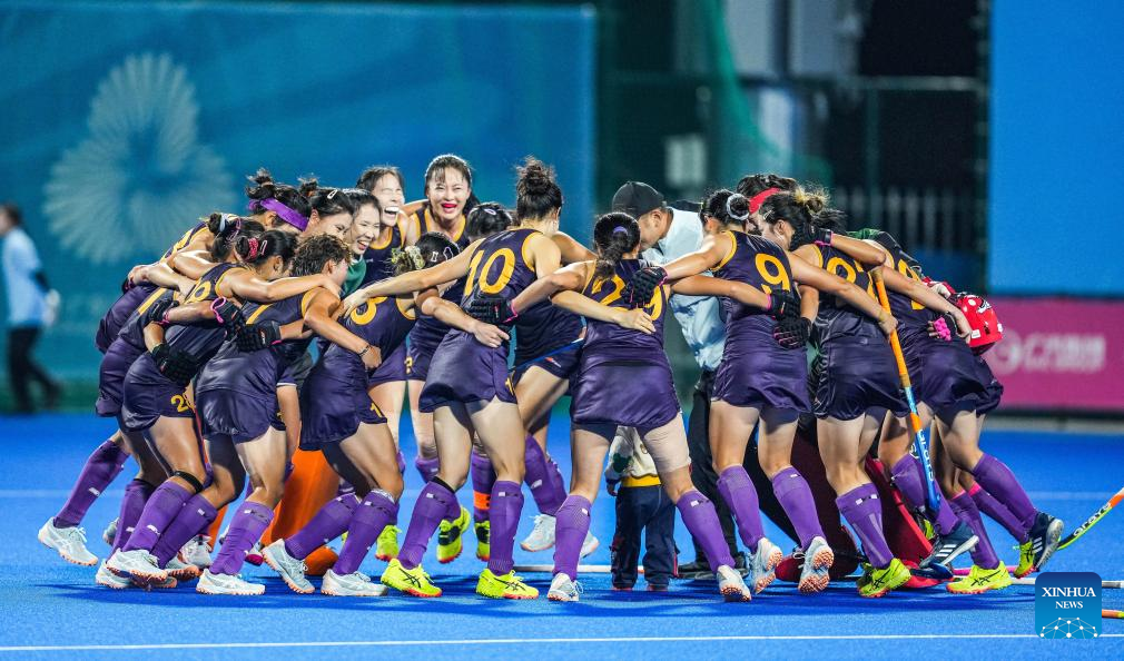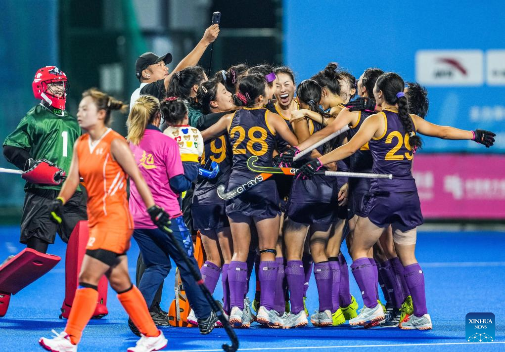 Players of Sichuan celebrate during the women's hockey gold medal match between Sichuan and Jilin at China's 15th National Games in Yunfu, south China's Guangdong Province, Nov. 14, 2025. (Xinhua/Tao Liang)