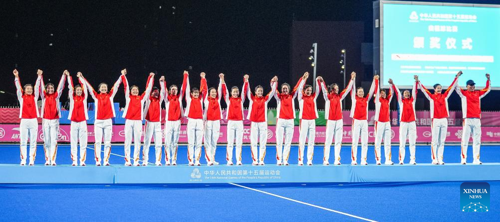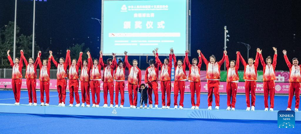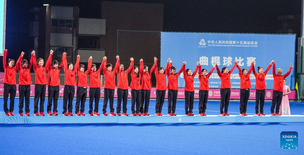 Gold medalists team Sichuan celebrate during the awarding ceremony for the women's hockey at China's 15th National Games in Yunfu, south China's Guangdong Province, Nov. 14, 2025. (Xinhua/Tao Liang)