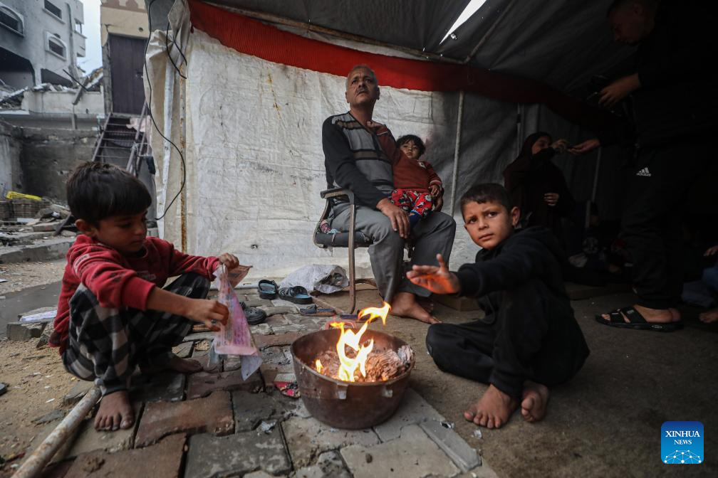 GAZA, Nov. 14 (Xinhua) -- Displaced Palestinians awoke to flooded tents Friday morning as the first autumn rain hit the Gaza Strip overnight, heightening fears of worsening living conditions as winter approaches.