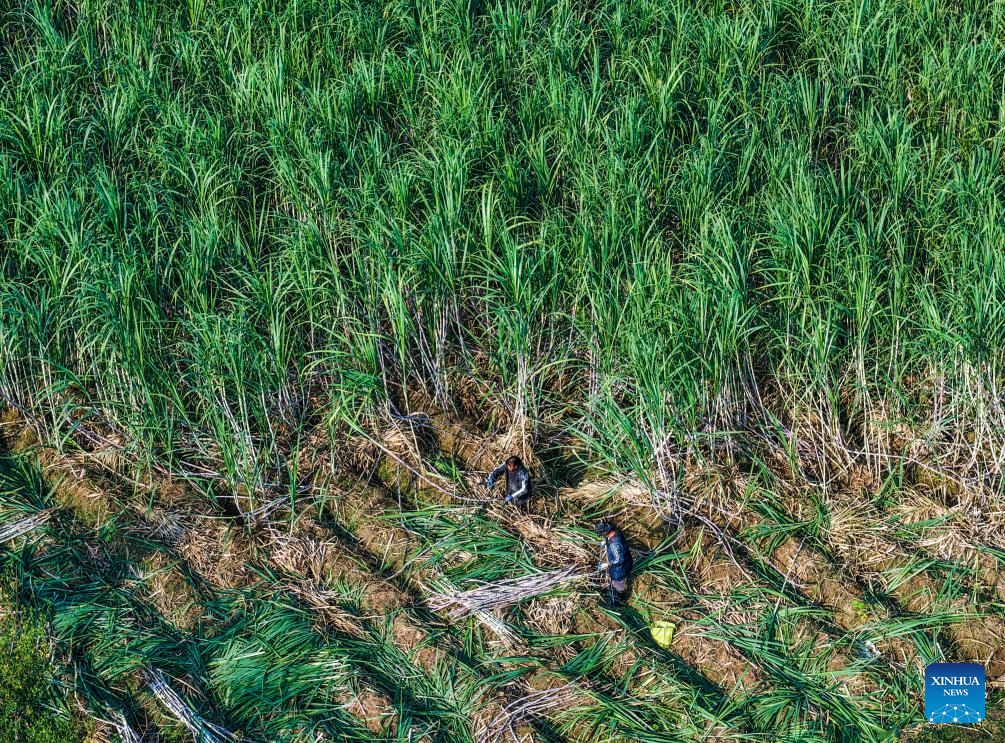 A drone photo shows workers harvesting sugarcane in Yiwu City, east China's Zhejiang Province, Nov. 15, 2025.