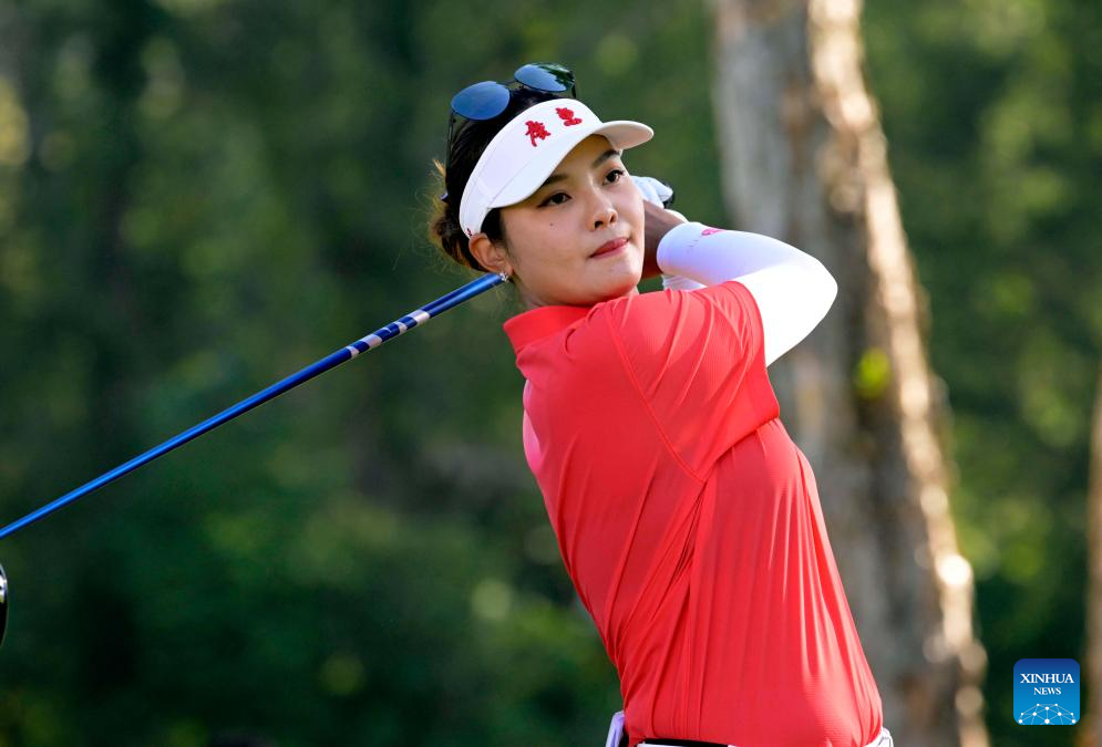 Zhang Weiwei of Guangdong competes during the women's individual final of golf at China's 15th National Games in Hong Kong, south China, Nov. 16, 2025. (Xinhua/Lo Ping Fai)