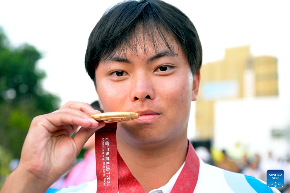 Kuang Yang of Zhejiang is seen after winning the men's individual final of golf at China's 15th National Games in Hong Kong, south China, Nov. 16, 2025. (Xinhua/Lo Ping Fai)