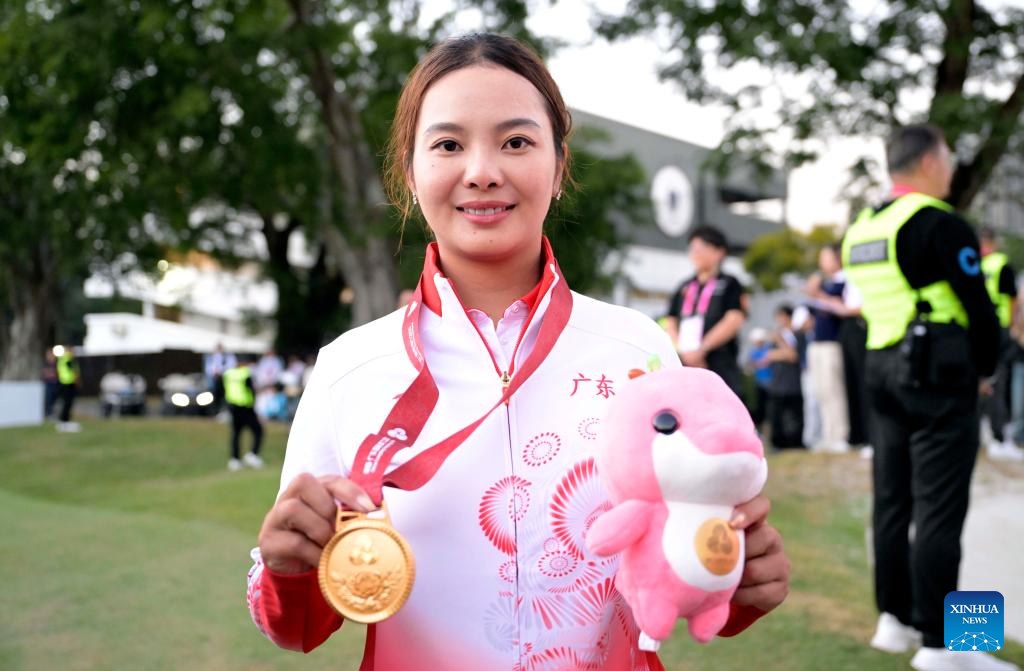 Zhang Weiwei of Guangdong is seen after winning the women's individual final of golf at China's 15th National Games in Hong Kong, south China, Nov. 16, 2025. (Xinhua/Lo Ping Fai)