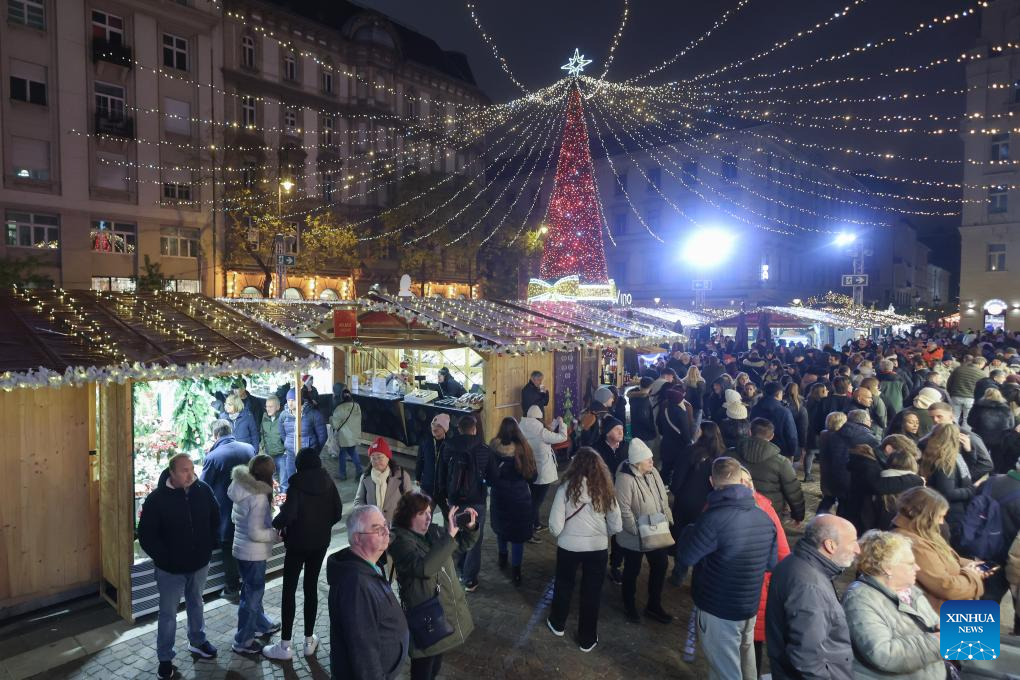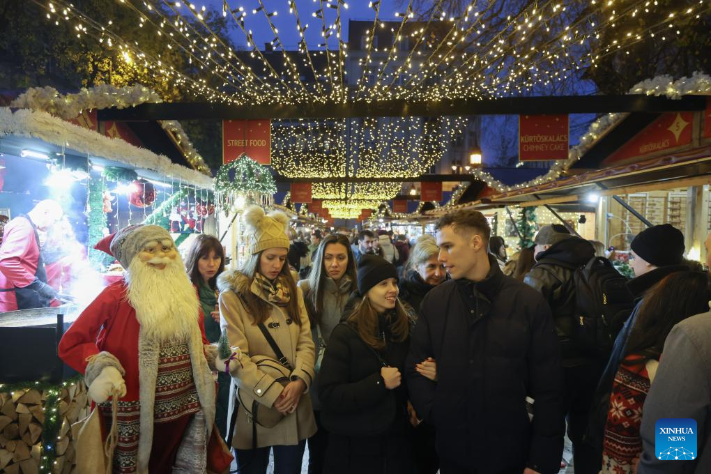 People visit a Christmas market in downtown Budapest, Hungary, on Nov. 15, 2025. The market opened here on Friday and will last till Jan. 1, 2026. (Photo by Attila Volgyi/Xinhua)