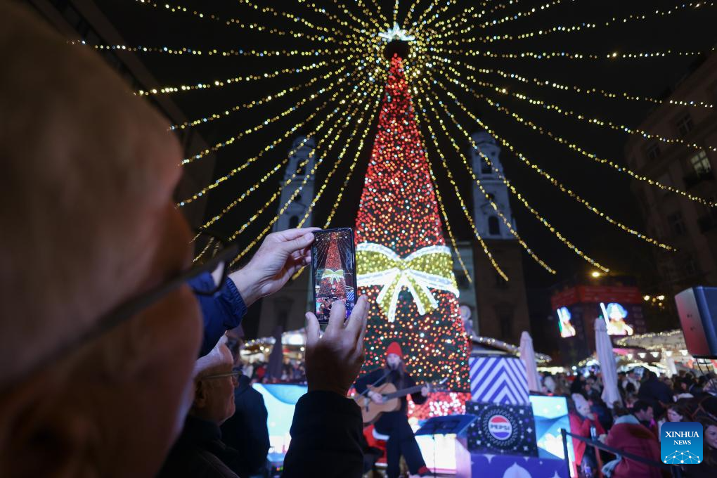 A visitor takes photos of a Christmas tree at a Christmas market in downtown Budapest, Hungary, on Nov. 15, 2025. The market opened here on Friday and will last till Jan. 1, 2026. (Photo by Attila Volgyi/Xinhua)