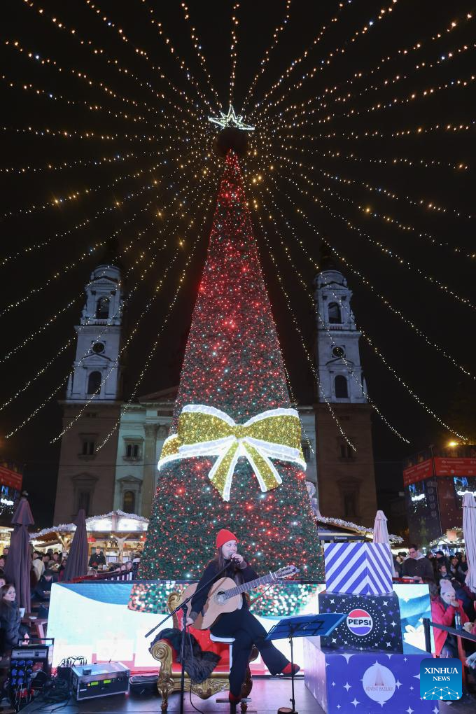 A singer performs at a Christmas market in downtown Budapest, Hungary, on Nov. 15, 2025. The market opened here on Friday and will last till Jan. 1, 2026. (Photo by Attila Volgyi/Xinhua)