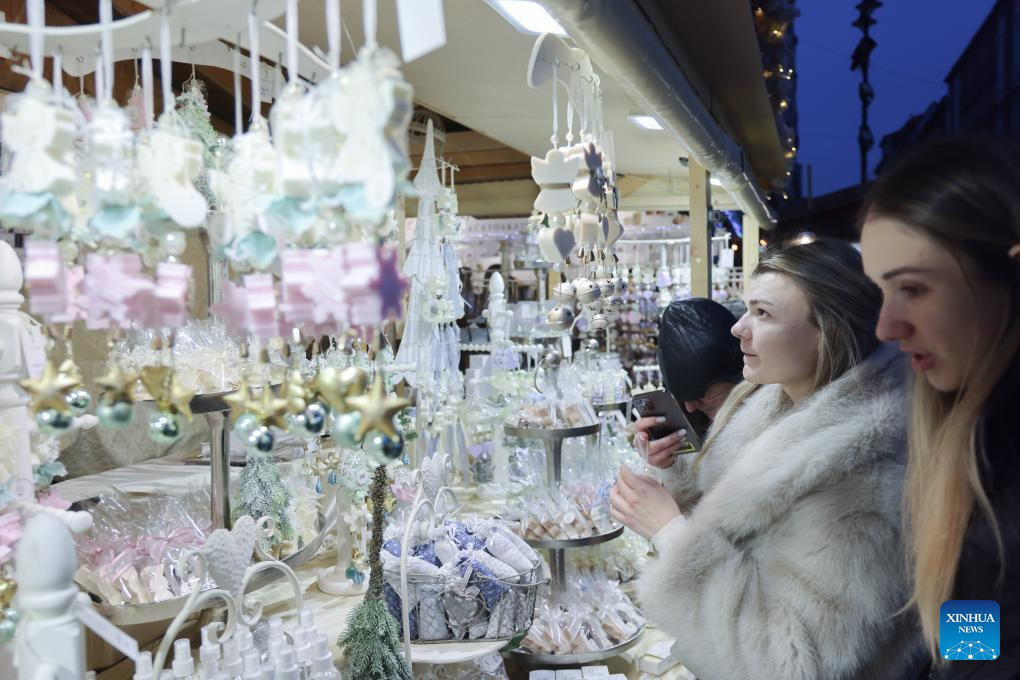People buy Christmas decorations at a Christmas market in downtown Budapest, Hungary, on Nov. 15, 2025. The market opened here on Friday and will last till Jan. 1, 2026. (Photo by Attila Volgyi/Xinhua)