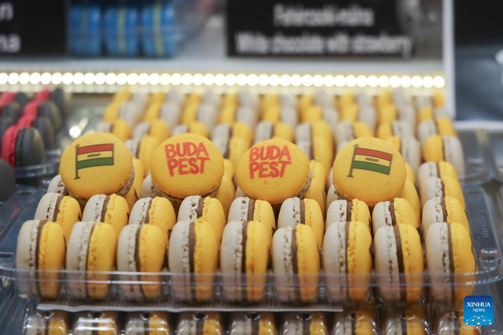 Macarons decorated with the word "Budapest" and the national flag of Hungary are seen at a Christmas market in downtown Budapest, Hungary, on Nov. 15, 2025. The market opened here on Friday and will last till Jan. 1, 2026. (Photo by Attila Volgyi/Xinhua)
