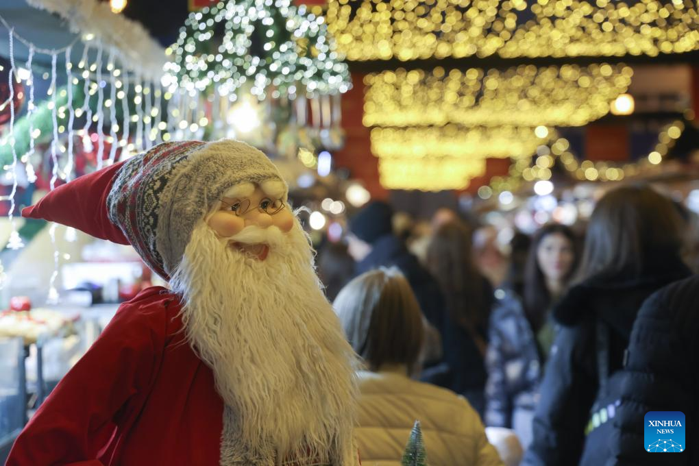 A Santa Claus figurine is seen at a Christmas market in downtown Budapest, Hungary, on Nov. 15, 2025. The market opened here on Friday and will last till Jan. 1, 2026. (Photo by Attila Volgyi/Xinhua)