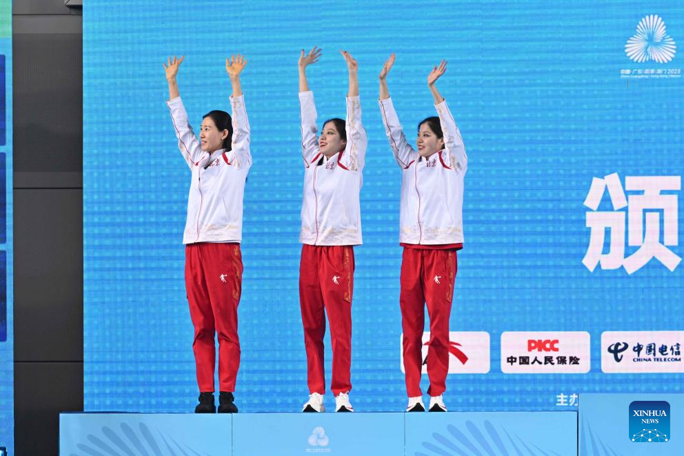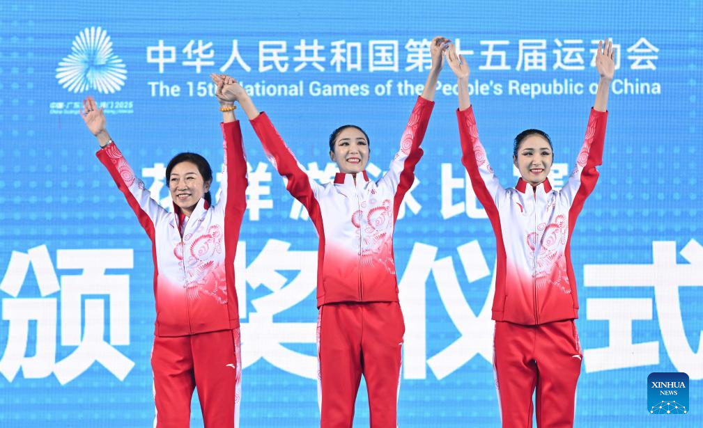 Gold medalists Wang Liuyi/Wang Qianyi of Guangdong and their coach wave during the awarding ceremony for the women's duet of artistic swimming at China's 15th National Games in Jiangmen, south China's Guangdong Province, Nov. 15, 2025. (Xinhua/Li Xin)