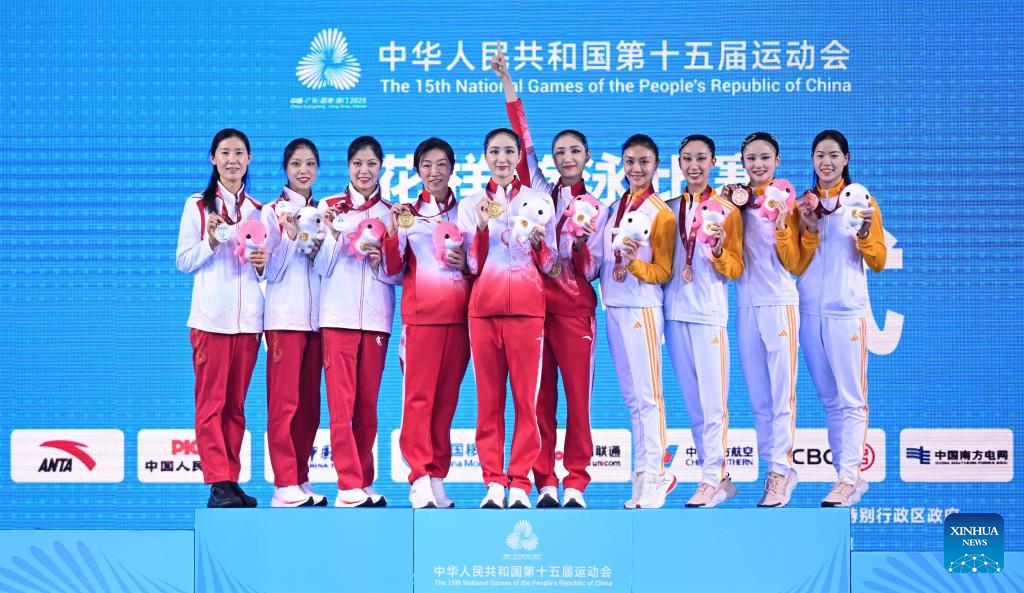 Gold medalists Wang Liuyi/Wang Qianyi of Guangdong, silver medalists Lin Yanhan/Lin Yanjun of Beijing and bronze medalists Fan Jiayi/Guo Sitong of Beijing Sport University pose during the awarding ceremony for the women's duet of artistic swimming at China's 15th National Games in Jiangmen, south China's Guangdong Province, Nov. 15, 2025. (Xinhua/Chen Zhonghao)