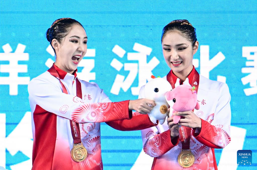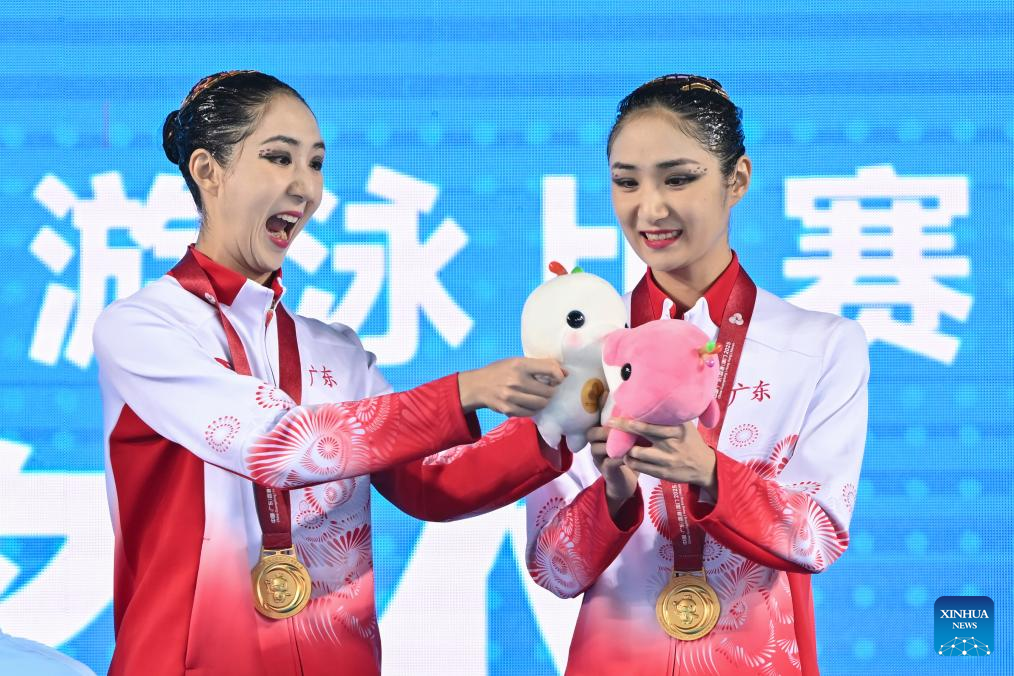 Gold medalists Wang Liuyi/Wang Qianyi of Guangdong hold the mascots during the awarding ceremony for the women's duet of artistic swimming at China's 15th National Games in Jiangmen, south China's Guangdong Province, Nov. 15, 2025. (Xinhua/Li Xin)