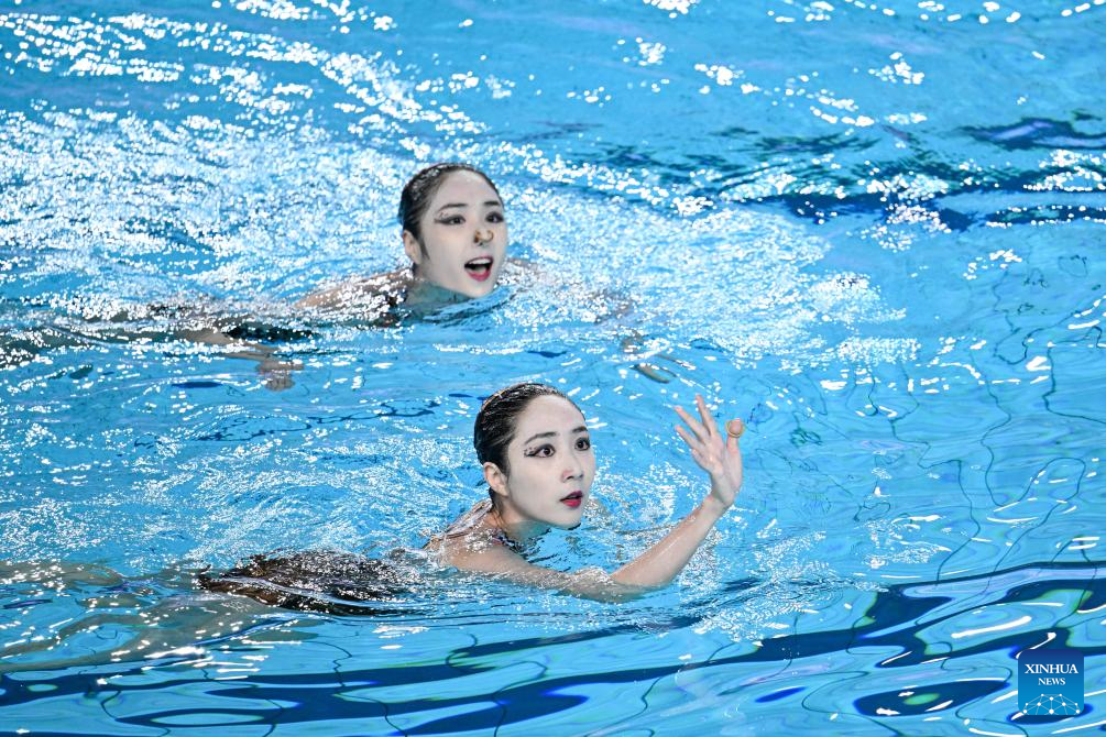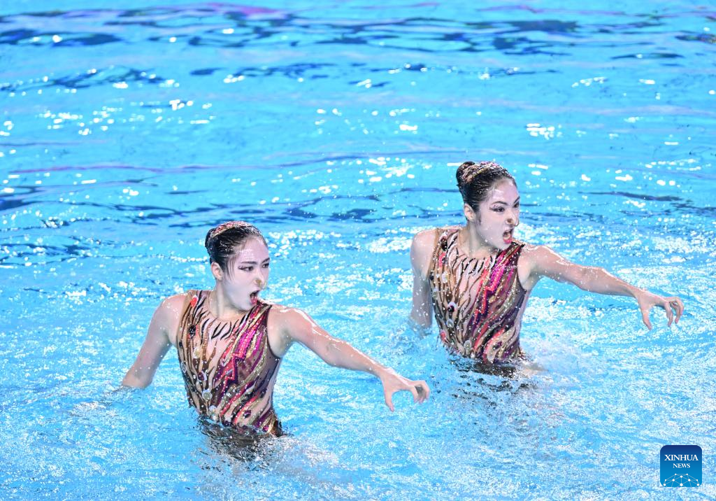 Wang Liuyi/Wang Qianyi of Guangdong compete during the women's duet free of artistic swimming at China's 15th National Games in Jiangmen, south China's Guangdong Province, Nov. 15, 2025. (Xinhua/Li Xin)